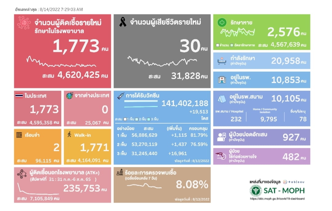 สำหรับจำนวนผู้ป่วยยืนยันสะสมในประเทศตั้งแต่ต้นปี 63 จนถึงล่าสุดอยู่ที่ 4,620,425 ราย โดยมีผู้ป่วยรักษาหายแล้วเพิ่มขึ้น 2,576 ราย ยอดเสียชีวิตสะสมเพิ่มเป็น 31,828 ราย