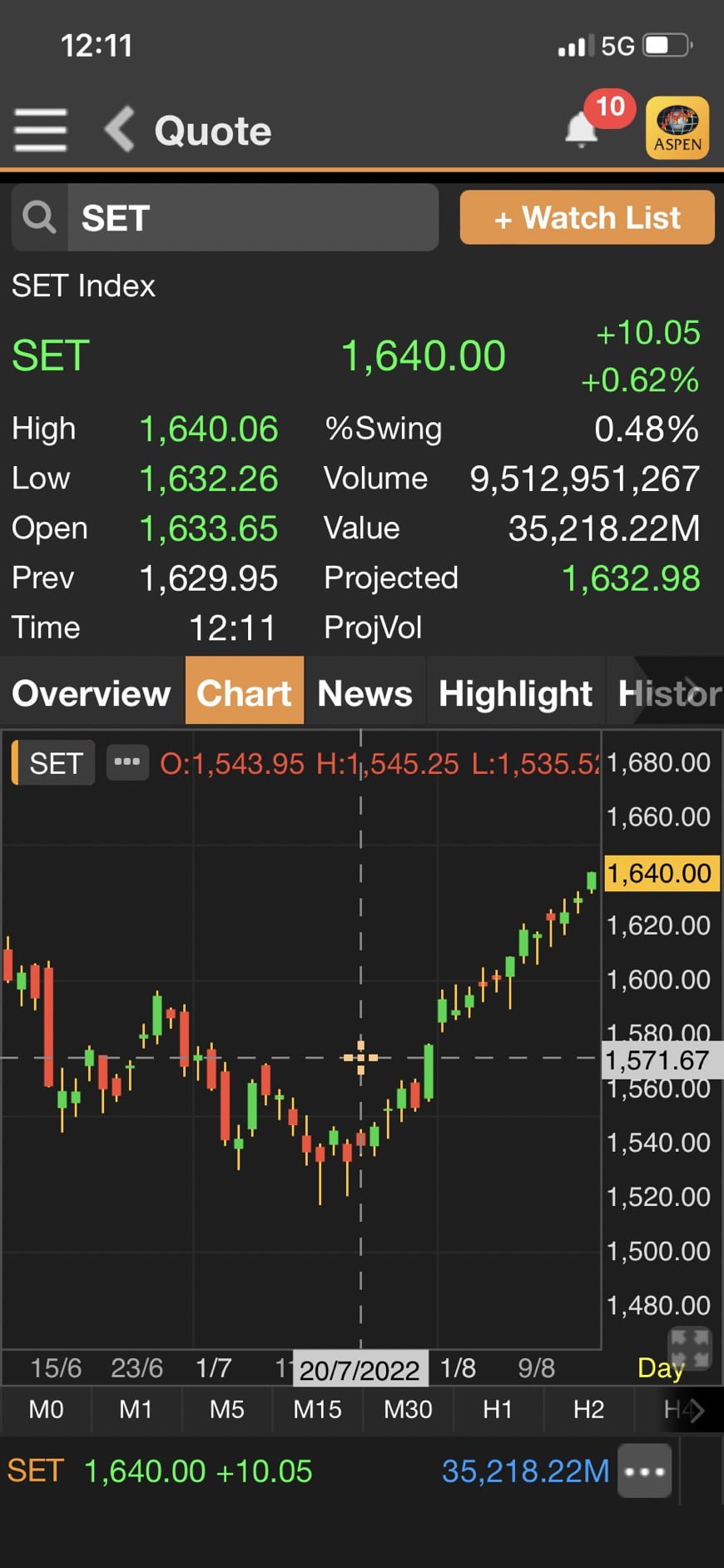 เมื่อเวลา 12.11 น.ดัชนี SET มาอยู่ที่ 1,640.00 จุด เพิ่มขึ้น 10.05 จุด (+0.62%)