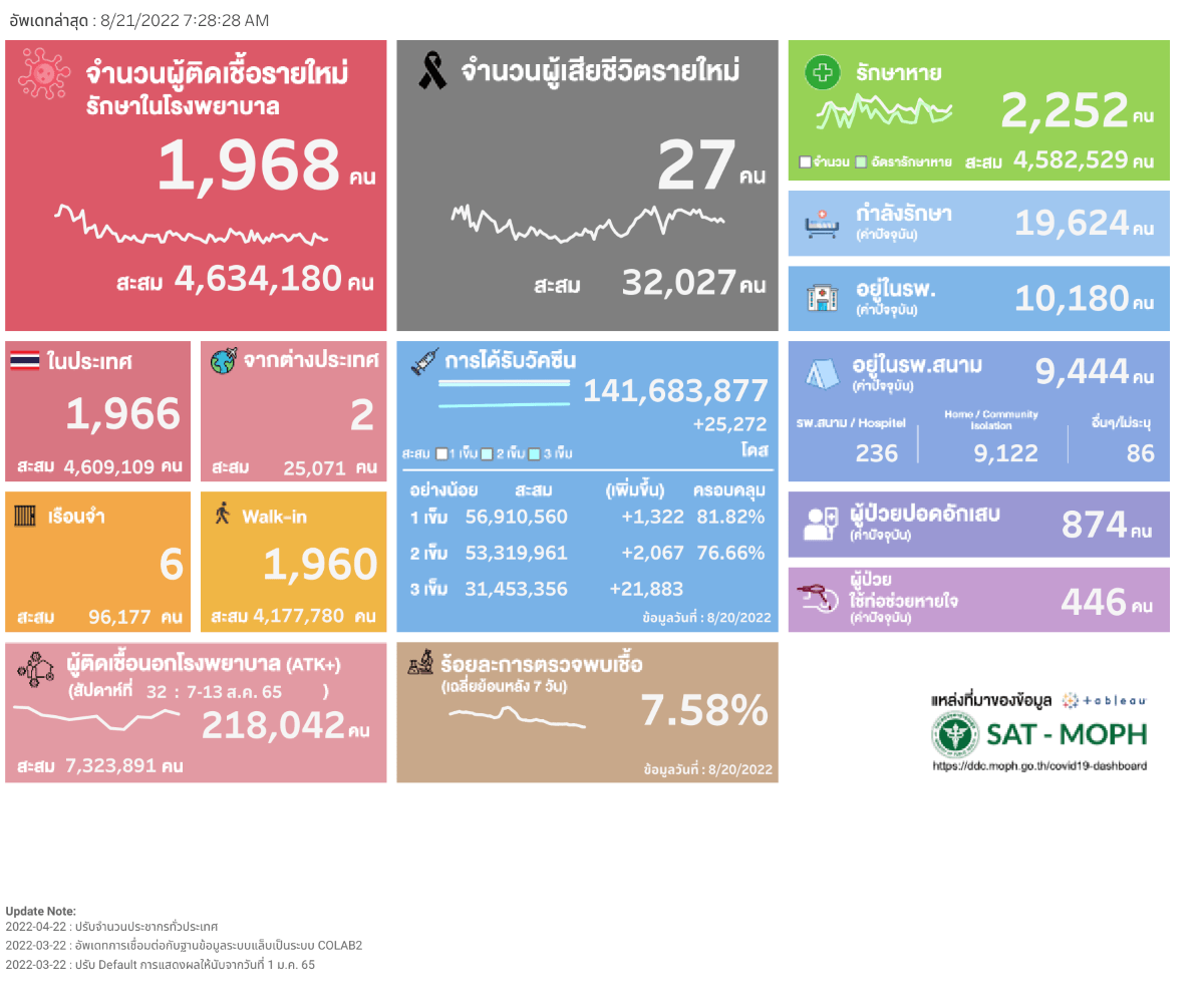 สำหรับจำนวนผู้ป่วยยืนยันสะสมในประเทศตั้งแต่ต้นปี 63 จนถึงล่าสุดอยู่ที่ 4,634,180 ราย โดยมีผู้ป่วยรักษาหายแล้วเพิ่มขึ้น 2,252 ราย ยอดเสียชีวิตสะสมเพิ่มเป็น 32,027 ราย