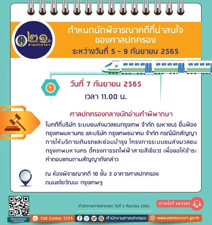 ศาลปกครองกลางนัดอ่านคำพิพากษาคดีที่ บมจ. ระบบขนส่งมวลชนกรุงเทพ (BTSC) ยื่นฟ้อง กรุงเทพมหานคร (กทม.) และบริษัท กรุงเทพธนาคม จำกัด (KT) ในวันที่ 7 ก.ย.เวลา 11.00 น. คดีพิพาทสัญญาทางปกครองกรณีผิดสัญญาการให้บริการเดินรถและซ่อมบำรุง โครงการระบบขนส่งมวลชนกรุงเทพมหานคร สายสีเขียว เพื่อขอให้ชำระค่าตอบแทนตามสัญญา หลังจาก BTSC ได้มีหนังสือลงวันที่ 12 ธันวาคม 62 แจ้งให้ กทม. และกรุงเทพธนาคม ชำระเงินแล้วแต่กลับเพิกเฉย เป็นเหตุให้ได้รับความเดือดร้อนเสียหาย