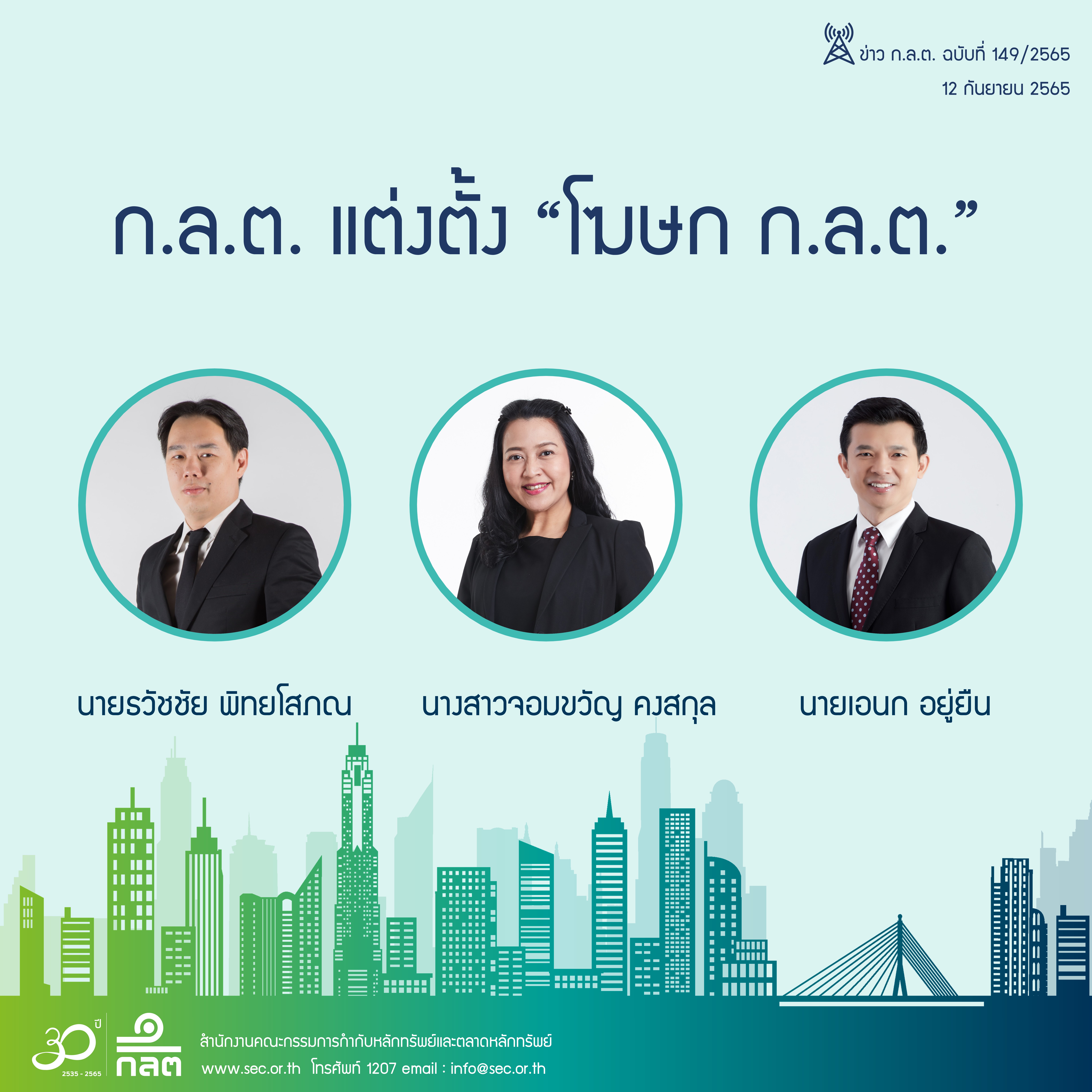 สำนักงานคณะกรรมการกำกับหลักทรัพย์และตลาดหลักทรัพย์ (ก.ล.ต.) เปิดเผยการแต่งตั้ง นายเอนก อยู่ยืน ผู้ช่วยเลขาธิการ สายบังคับใช้กฎหมาย เป็นผู้ปฏิบัติหน้าที่โฆษก ก.ล.ต. เพิ่มเติมจากที่มีนายธวัชชัย พิทยโสภณ ผู้ช่วยเลขาธิการ สายกฎหมาย และนางสาวจอมขวัญ คงสกุล ผู้ช่วยเลขาธิการ สายระดมทุน รวมเป็น 3 คน โดยมีผลตั้งแต่วันที่ 12 กันยายน 2565 เป็นต้นไป