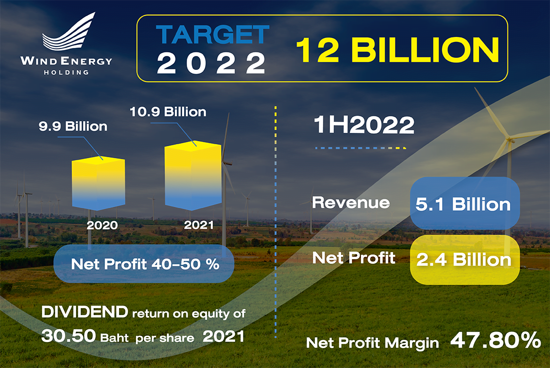 นายณัฐพศิน กล่าวว่า ส่วนปี 65 นี้ บริษัทตั้งเป้ารายได้เติบโต 5-7% หรือเพิ่มมาที่ 12,000 ล้านบาท จากปีก่อนมีรายได้ 10,985 ล้านบาท โดยครึ่งปีแรกมีรายได้รวม 5,100 ล้านบาท เนื่องจากรายได้จากการขายไฟฟ้าลดลงเล็กน้อยเมื่อเทียบกับช่วงเดียวกันปีก่อนตามปริมาณลมลดลง ส่วนรายได้อื่นสูงกว่าปีที่แล้ว ส่วนในด้านค่าใช้จ่ายลดลง 110 ล้านบาท หรือ 13% และสามารถสร้างกระแสเงินสดจากการดำเนินงานราว 4,900 ล้านบาท