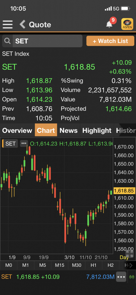 - เมื่อเวลา 10.05 น.ดัชนี SET มาอยู่ที่ 1,618.85 จุด เพิ่มขึ้น 10.09 จุด (+0.63%)
