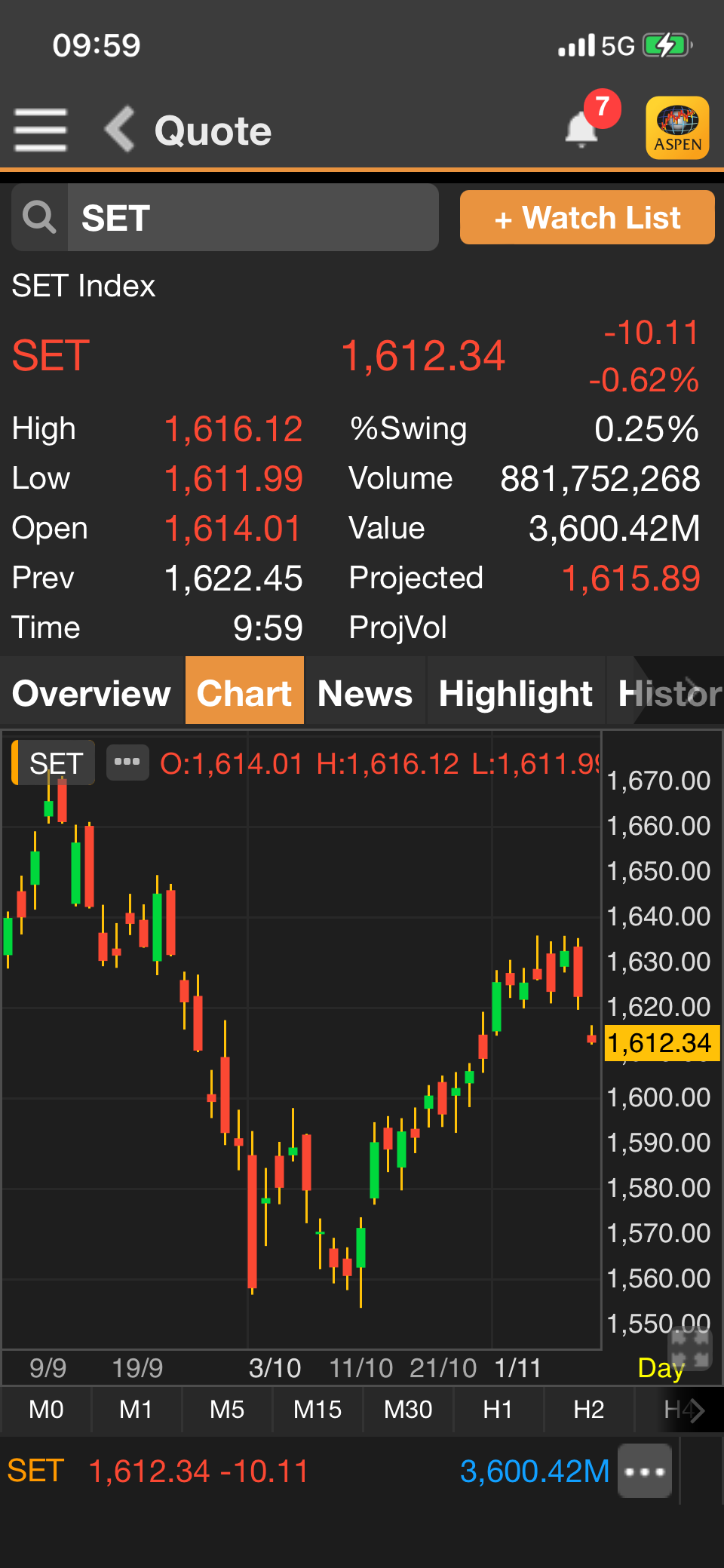 เมื่อเวลา 9.59 น.ดัชนี SET มาอยู่ที่ 1,612.34 จุด ลดลง 10.11 จุด (-0.62%)
