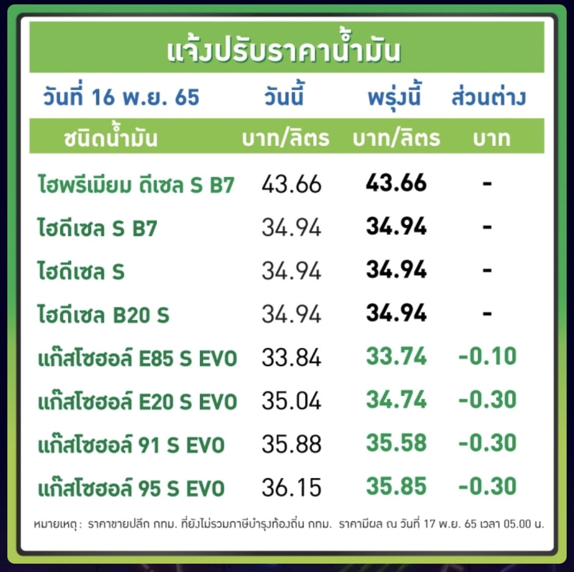 บมจ.ปตท.น้ำมันและการค้าปลีก (OR) และ บมจ.บางจาก คอร์ปอเรชั่น (BCP) ปรับราคาขายปลีกน้ำมันกลุ่มเบนซินและแก๊สโซฮอล์ทุกชนิดลง 0.30 บาท/ลิตร ยกเว้น E85 ลดลง 0.10 บาท/ลิตร ส่วนกลุ่มดีเซลคงเดิม มีผลตั้งแต่วันพรุ่งนี้ (17 พ.ย. 65) เวลา 05.00 น. เป็นต้นไป