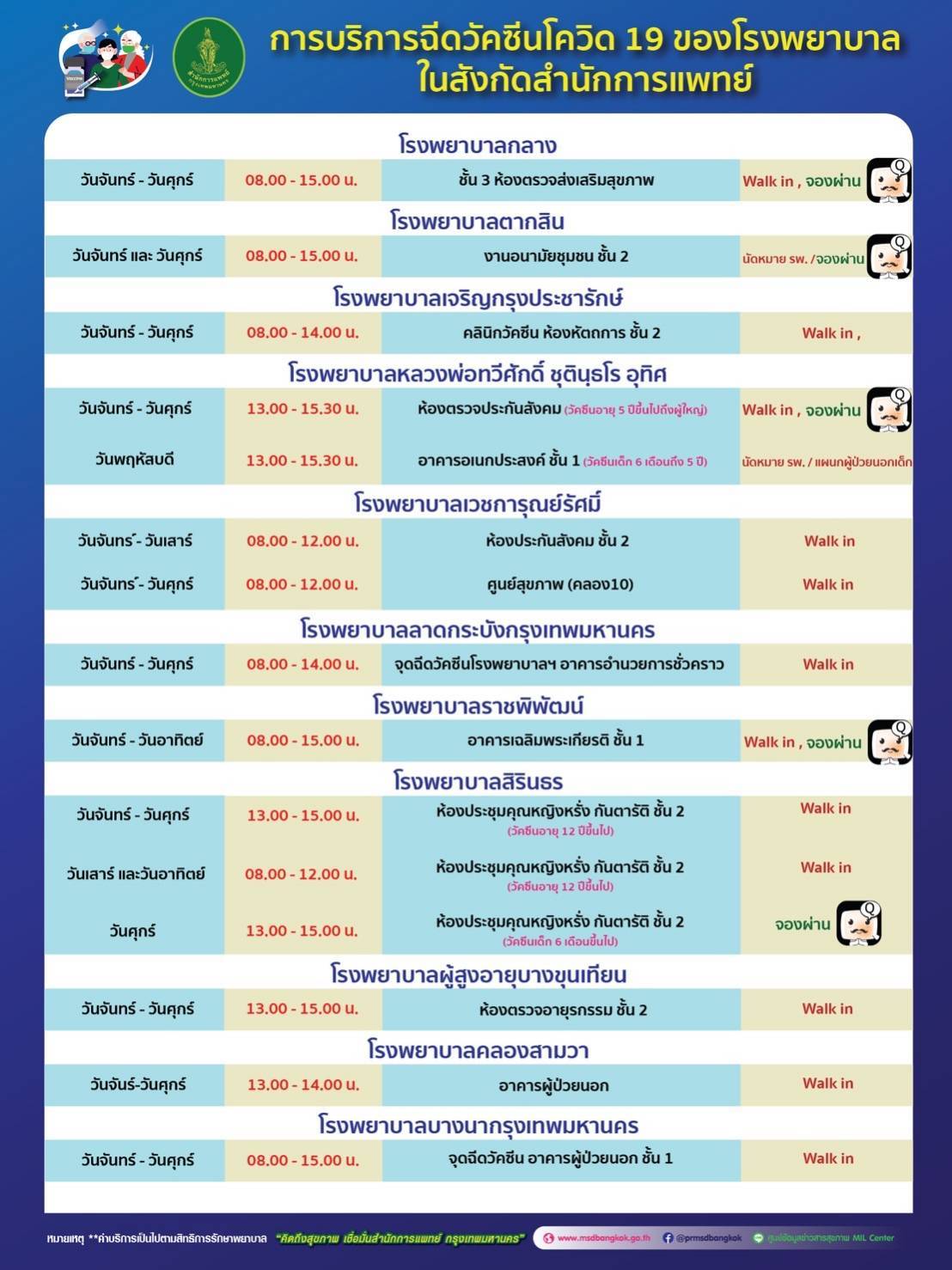 ขณะเดียวกันยังสามารถรับบริการฉีดวัคซีนโควิด 19 ตามสิทธิการรักษา ณ สถานพยาบาลที่คณะกรรมการโรคติดต่อกรุงเทพมหานครกำหนด โดยสามารถจองผ่านแอปพลิเคชัน QueQ และ Walk in ได้ที่โรงพยาบาลในสังกัดกรุงเทพมหานครทั้ง 11 แห่ง