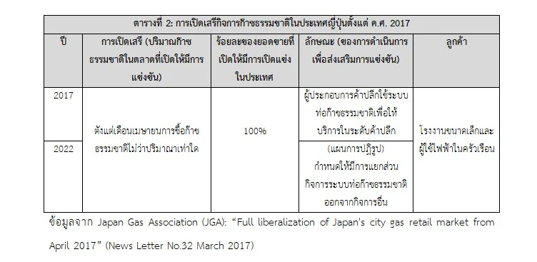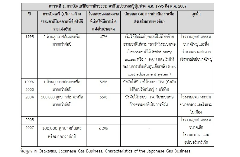 ใน ปี ค.ศ. 1995 ประเทศญี่ปุ่นเริ่มนโยบายการเปิดเสรีกิจการก๊าซธรรมชาติในส่วนของกิจการค้าปลีกสำหรับผู้ใช้ก๊าซธรรมชาติรายใหญ่ โดยทยอยเพิ่มการเปิดเสรีไปตามเวลา (ใน ปี ค.ศ. 1999 ค.ศ. 2004 และ ค.ศ. 2007) ซึ่งสามารถแสดงได้ตามตามตารางที่ 1*