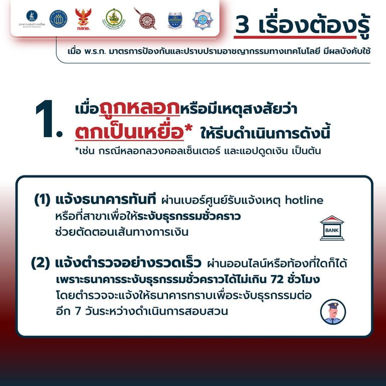 ทั้งนี้ ธปท. จะติดตามและเร่งให้สถาบันการเงิน ดำเนินการตาม พ.ร.ก. และมาตรการของ ธปท. ให้แล้วเสร็จตามกำหนด รวมถึงประเมินประสิทธิผล เพื่อปรับปรุงการรับมือของภาคการธนาคารต่อภัยการเงินอย่างต่อเนื่องและเท่าทัน