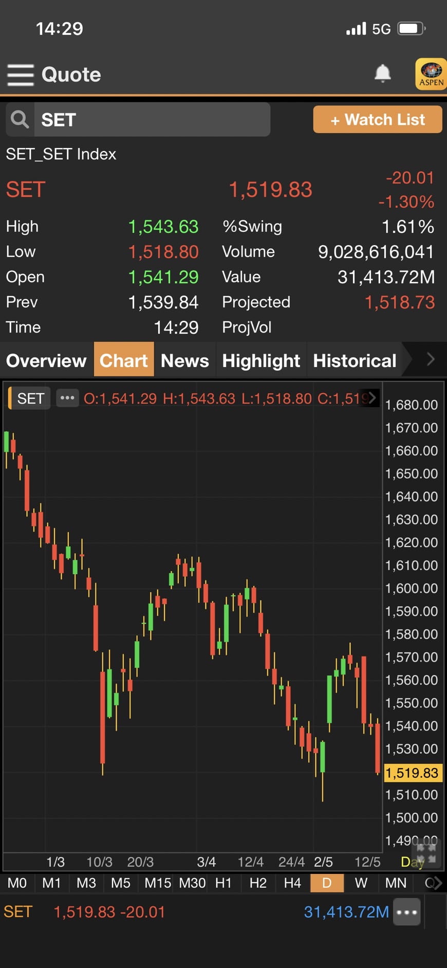 เมื่อเวลา 14.29 น. ดัชนี SET มาอยู่ที่ 1,519.83 จุด ลดลง 20.01 จุด (-1.30%)