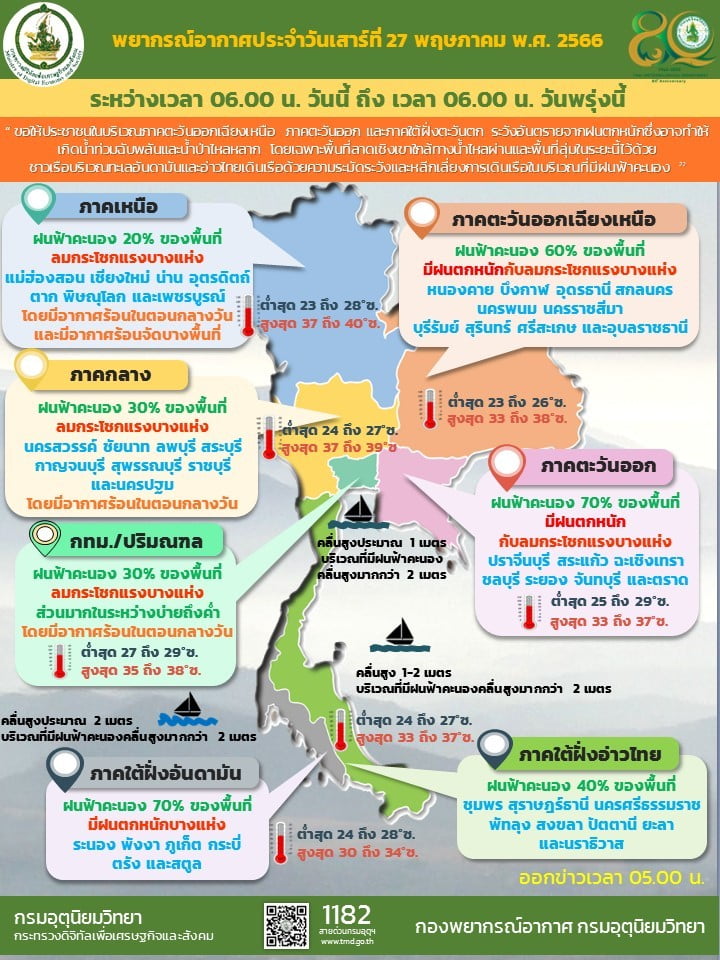 กรมอุตุนิยมวิทยา พยากรณ์อากาศ 24 ชั่วโมงข้างหน้า มรสุมตะวันตกเฉียงใต้กำลังปานกลางที่พัดปกคลุมทะเลอันดามัน ประเทศไทย และอ่าวไทยเริ่มมีกำลังแรงขึ้น ประกอบกับมีหย่อมความกดอากาศต่ำปกคลุมบริเวณชายฝั่งประเทศเวียดนามตอนล่าง ลักษณะเช่นนี้ทำให้ประเทศไทยมีฝนฟ้าคะนอง กับมีลมกระโชกแรงเกิดขึ้นได้บางพื้นที่ แต่ยังคงมีอากาศร้อนในตอนกลางวัน และมีอากาศร้อนจัดบางแห่งในภาคเหนือ โดยมีฝนตกหนักบางพื้นที่ในภาคตะวันออกเฉียงเหนือ ภาคตะวันออก และภาคใต้ฝั่งตะวันตก ขอให้ประชาชนในบริเวณดังกล่าวระวังอันตรายจากฝนตกหนัก ซึ่งอาจทำให้เกิดน้ำท่วมฉับพลันและน้ำป่าไหลหลาก โดยเฉพาะพื้นที่ลาดเชิงเขาใกล้ทางน้ำไหลผ่านและพื้นที่ลุ่มในระยะนี้ไว้ด้วย