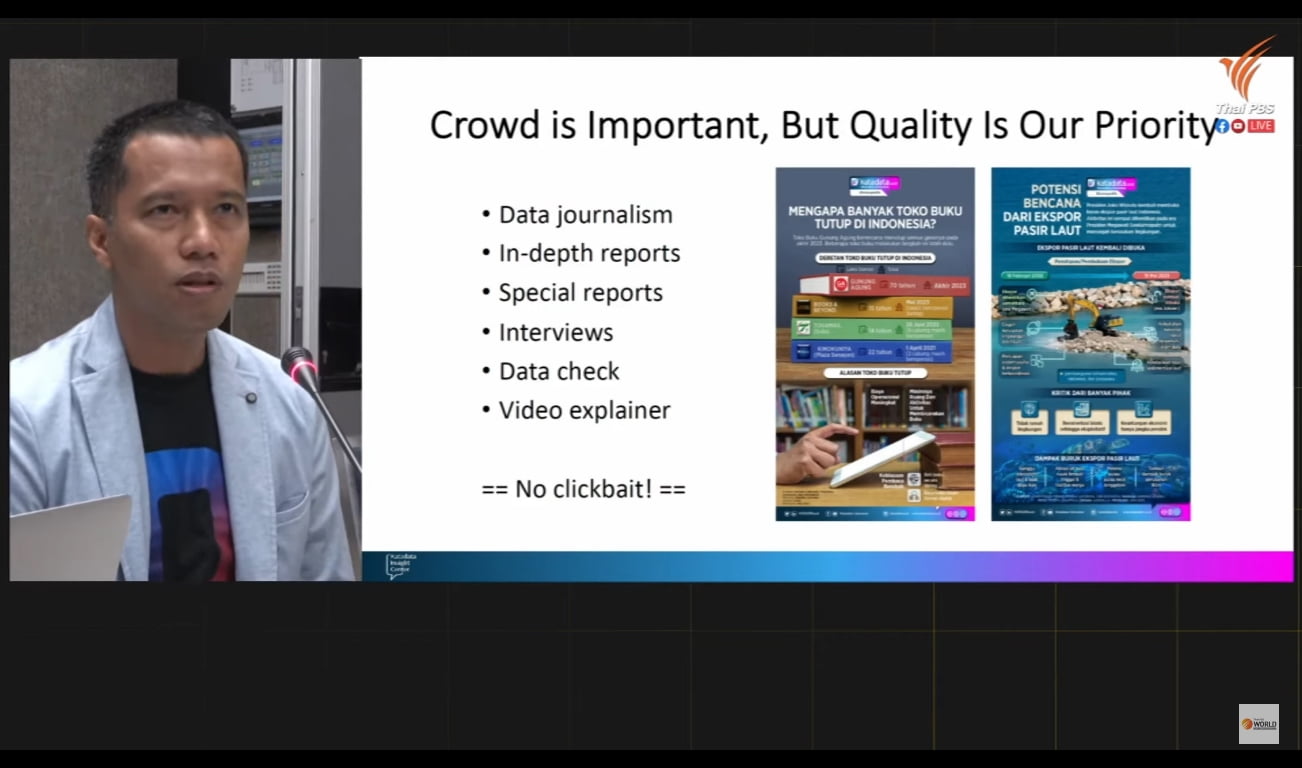 ทางด้าน ดร. อเด็ค โรซ่า (Adek Roza Ph.D) ผู้อำนวยการของ Katadata Insight Center องค์กรผู้ให้บริการข้อมูลและสถิติเชิงลึกในประเทศอินโดนีเซีย ได้ชี้ให้เห็นถึงความสำคัญของคุณภาพคอนเทนต์ในยุคดิจิทัล โดยผู้ที่จะสร้างสรรค์คอนเทนต์ให้มีคุณภาพขึ้นมานั้นก็คือนักข่าว เพราะข้อมูลดิบหรือข่าวจะไม่สามารถขายตัวเองได้ นักข่าวจะต้องหยิบข้อมูลมาเขียนและนำเสนอออกมาในรูปแบบที่น่าสนใจและสร้างแรงสั่นสะเทือนให้กับผู้ชม ข่าวที่มีคุณภาพสูงอาจจะไม่ดึงดูดผู้ชมได้เท่าข่าวที่มีลักษณะเป็น Clickbait ซึ่งมุ้งเน้นไปที่การล่อความสนใจจากผู้พบเห็นเป็นหลัก แต่การสร้างแรงสั่นสะเทือนให้สำเร็จได้ จะทำให้ข่าวชิ้นนั้นถูกนำไปกล่าวถึง เป็นที่จดจำ หรือได้รับการตอบรับจากหน่วยงาน องค์กร หรือแม้แต่รัฐบาลของอินโดนีเซีย เนื่องจากพื้นเพของแวดวงสื่ออินโดนีเซียมีเสรีภาพสูง สามารถวิพากษ์วิจารณ์ประเด็นใดๆ ได้อย่างอิสระ