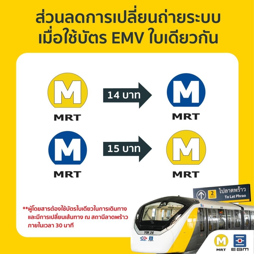 ทั้งนี้ ผู้โดยสารที่เดินทางเชื่อมต่อระหว่างระบบรถไฟฟ้า MRT สายสีเหลือง – MRT สายสีน้ำเงิน (สายเฉลิมรัชมงคล) ที่สถานีลาดพร้าว และชำระค่าโดยสารด้วยบัตร EMV Contactless ใบเดียวกัน จะได้รับส่วนลดการเปลี่ยนถ่ายระบบ หากเดินทางเชื่อมต่อภายในระยะเวลา 30 นาที