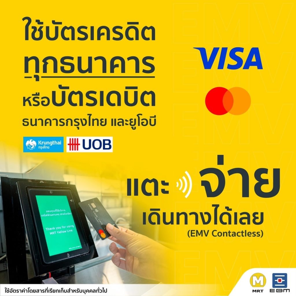 - บัตร EMV Contactless โดยใช้บัตรเครดิตวีซ่า (VISA) หรือมาสเตอร์การ์ด (Mastercard) ของธนาคารใดก็ได้ รวมถึงบัตรเดบิตของธนาคารกรุงไทย บัตรเดบิตของธนาคารยูโอบี และบัตรเดบิต Play Card (สมัครผ่านแอปพลิเคชันเป๋าตังค์) ที่มีสัญลักษณ์ Contactless Payment บนหน้าบัตรหรือหลังบัตร แตะเข้า-แตะออกระบบรถไฟฟ้าที่จุดให้บริการเครื่อง EDC บริเวณประตูพิเศษ (Swing Gate) โดยมีแผนจะขยายจุดให้บริการเพิ่มเติมให้ครบทุกประตูจัดเก็บค่าโดยสารอัตโนมัติ (AFC Gate) ในลำดับถัดไป