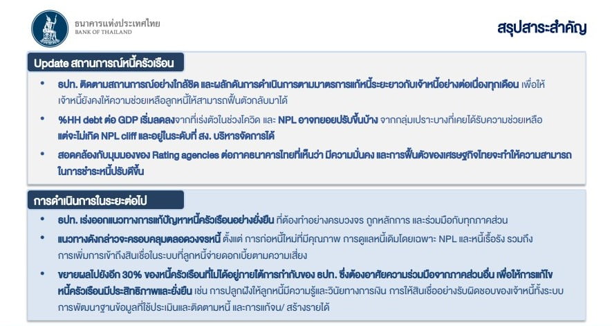 พร้อมระบุว่า การแก้ไขปัญหาหนี้ครัวเรือนให้ได้อย่างมีประสิทธิภาพและยั่งยืน ต้องอาศัยความร่วมมือจากภาคส่วนอื่น เพื่อขยายผลไปยังอีก 30% ของหนี้ครัวเรือนที่ไม่ได้อยู่ภายใต้การกำกับของ ธปท. ด้วย เช่น การปลูกฝังให้ลูกหนี้มีความรู้และวินัยทางการเงินการให้สินเชื่ออย่างรับผิดชอบของเจ้าหนี้ทั้งระบบ ตลอดจนการพัฒนาฐานข้อมูลที่ใช้ประเมินและติดตามหนี้ และการแก้จน/ สร้างรายได้ เป็นต้น