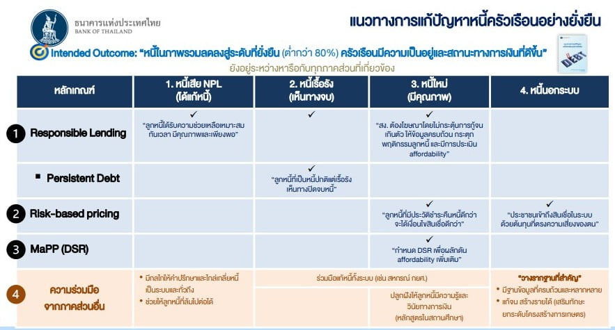 (3) มาตรการ Macroprudential Policy (MAPP) ให้เจ้าหนี้ให้สินเชื่อสอดคล้องกับความสามารถในการชำระหนี้ และลูกหนี้มีเงินเหลือพอดำรงชีพ ไม่นำไปสูงการก่อหนี้สินเกินตัว เช่น การคุมหนี้ไม่ให้อยู่ในระดับสูงเกินไปเมื่อเทียบกับรายได้ในแต่ละเดือน (DSR)