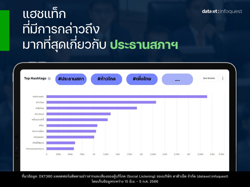 บริษัท ดาต้าเซ็ต จำกัด ได้เก็บข้อมูลและวิเคราะห์จากการฟังเสียงประชาชนในสังคมออนไลน์ ผ่านเครื่องมือ DXT360 โดยเก็บข้อมูลระหว่างวันที่ 15 มิถุนายน – 5 กรกฎาคม 2566 พบว่า มีค่า Buzz ซึ่งเป็นการกล่าวถึง (Mention) รวมกับการมีส่วนร่วม (Engagement) ในเรื่องประธานสภาฯ สูงถึง 16,287,997 ครั้ง โดย Facebook เป็นแพลตฟอร์มที่มี Buzz มากที่สุด