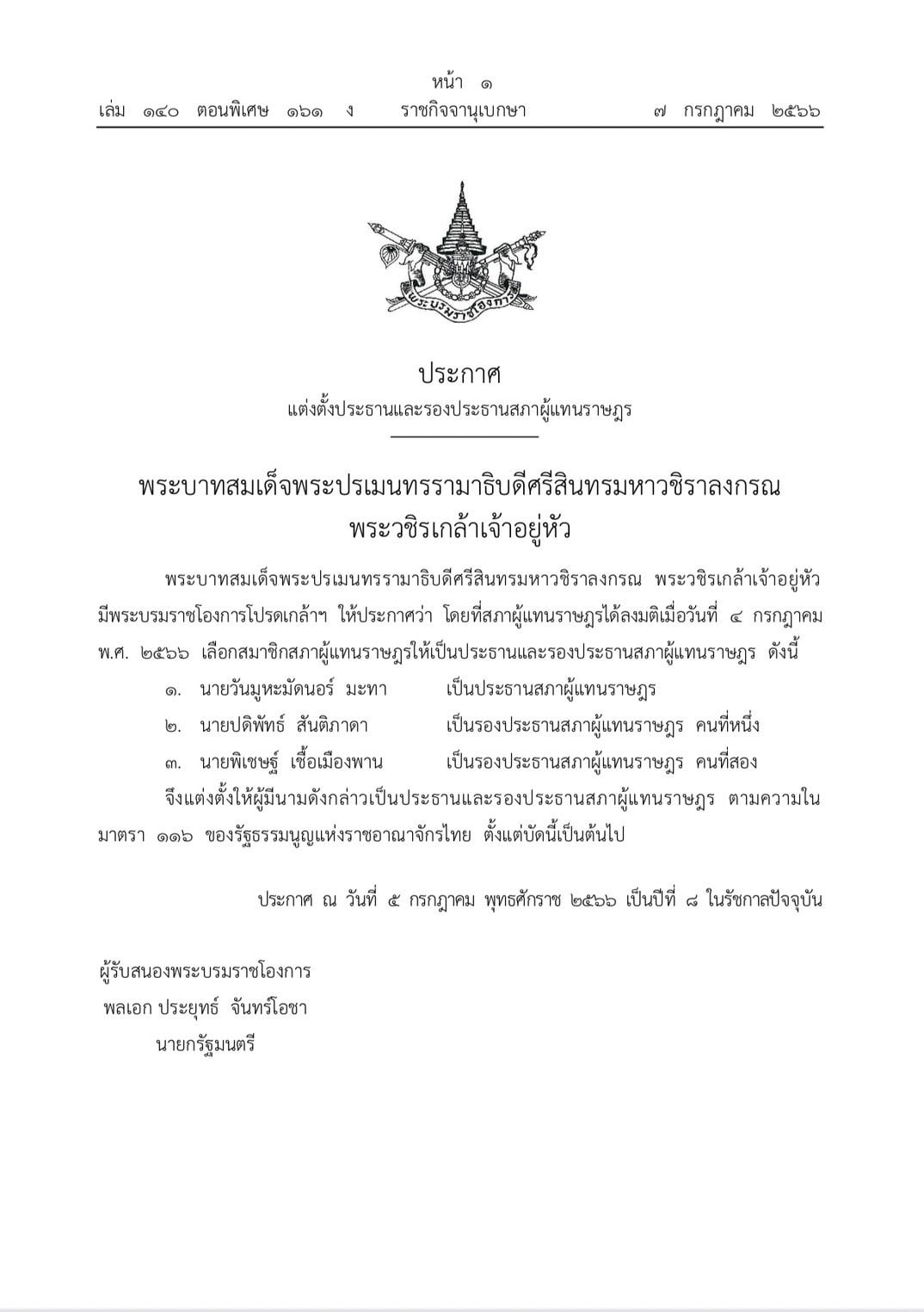 เว็บไซต์ราชกิจจานุเบกษา เผยแพร่ประกาศแต่งตั้งประธานและรองประธานสภาผู้แทนราษฎร ความว่า พระบาทสมเด็จพระปรเมนทรรามาธิบดีศรีสินทรมหาวชิราลงกรณ พระวชิรเกล้าเจ้าอยู่หัว มีพระบรมราชโองการโปรดเกล้าฯ แต่งตั้ง