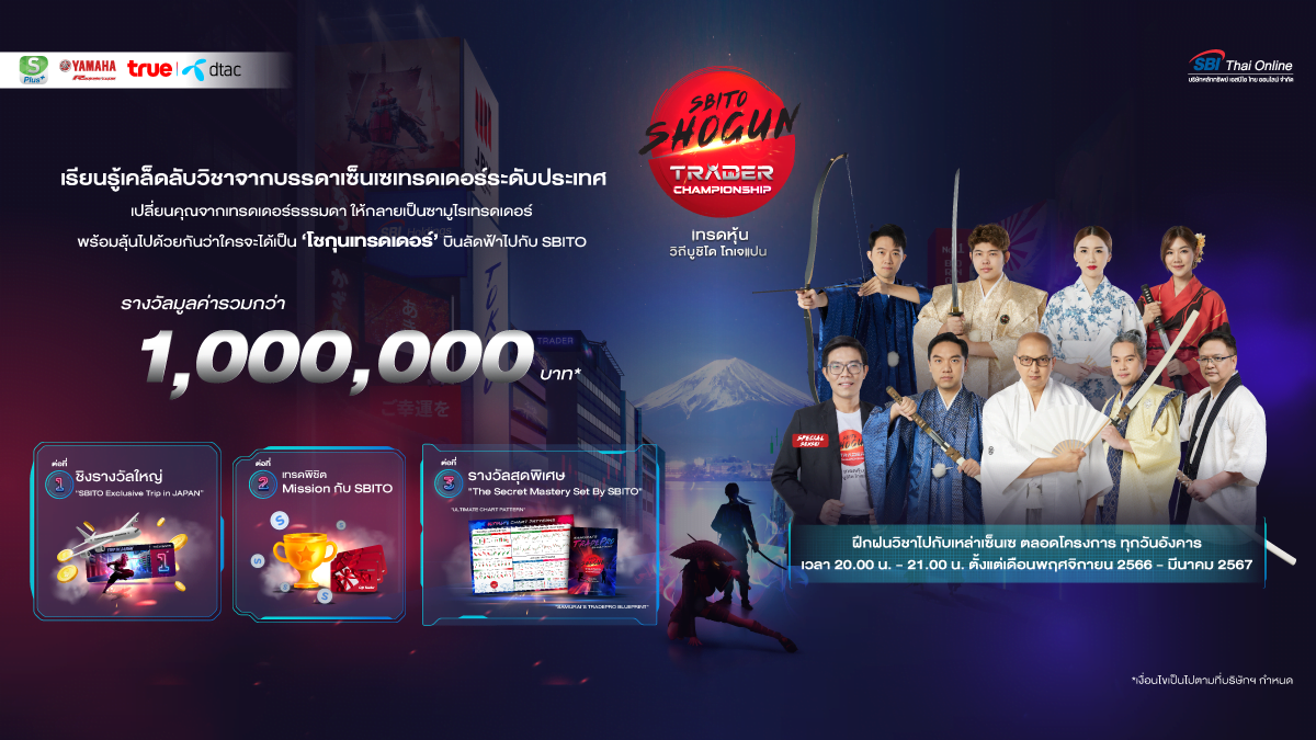 บริษัทหลักทรัพย์ เอสบีไอ ไทยออนไลน์ จำกัด โบรกเกอร์ออนไลน์อันดับ 1 จากประเทศญี่ปุ่น เปิดตัวกิจกรรมแข่งขันเทรดหุ้นแห่งปี ‘SBITO SHOGUN TRADER CHAMPIONSHIP เทรดหุ้น วิถีบูชิโด โกเจแปน’ ระยะเวลาการแข่งขัน 5 เดือน เพื่อเฟ้นหาเทรดเดอร์ผู้แข็งแกร่ง 1 คนประจำเดือน เพื่อพิชิตรางวัลตลอดโครงการรวมมูลค่ากว่า 1,000,000 บาท ครอบคลุมรางวัลทริปเที่ยวญี่ปุ่น พร้อมดูงานที่ตลาดหลักทรัพย์โตเกียว (Japan Stock Exchange:TSE) เป็นเวลา 5 วัน 3 คืน