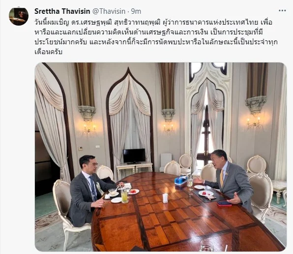 นายเศรษฐา ทวีสิน นายกรัฐมนตรี และ รมว.คลัง ทวิตผ่านเอ็กซ์ (X) ระบุว่า ในวันนี้ได้เชิญนายเศรษฐพุฒิ สุทธิวาทนฤพุฒิ ผู้ว่าการธนาคารแห่งประเทศไทย (ธปท.) มาหารือเพื่อแลกเปลี่ยนความคิดเห็นด้านเศรษฐกิจและการเงิน โดยหลังจากนี้ จะมีการนัดพบหารือกันในลักษณะนี้เป็นประจำทุกเดือน