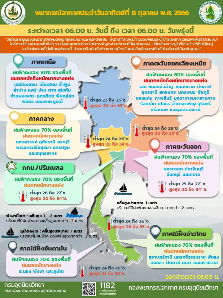 กรมอุตุนิยมวิทยา พยากรณ์อากาศ 24 ชั่วโมงข้างหน้า ร่องมรสุมพาดผ่านภาคเหนือ และภาคตะวันออกเฉียงเหนือ ในขณะที่มรสุมตะวันตกเฉียงใต้ยังคงพัดปกคลุมทะเลอันดามัน ประเทศไทย และอ่าวไทย ลักษณะเช่นนี้ทำให้ประเทศไทยมีฝนตกหนักบางแห่ง และมีฝนตกหนักมากบางพื้นที่ในภาคเหนือ และภาคตะวันออกเฉียงเหนือ ขอให้ประชาชนในบริเวณดังกล่าวระวังอันตรายจากฝนตกหนักถึงหนักมากและฝนที่ตกสะสม ซึ่งอาจทำให้เกิดน้ำท่วมฉับพลันและน้ำป่าไหลหลาก โดยเฉพาะพื้นที่ลาดเชิงเขาใกล้ทางน้ำไหลผ่านและพื้นที่ลุ่ม รวมทั้งเพิ่มความระมัดระวังในการสัญจรผ่านบริเวณที่มีฝนฟ้าคะนอง หลีกเลี่ยงการอยู่ในที่โล่งแจ้ง ใต้ต้นไม้ใหญ่ และป้ายโฆษณาที่ไม่แข็งแรงในระยะนี้