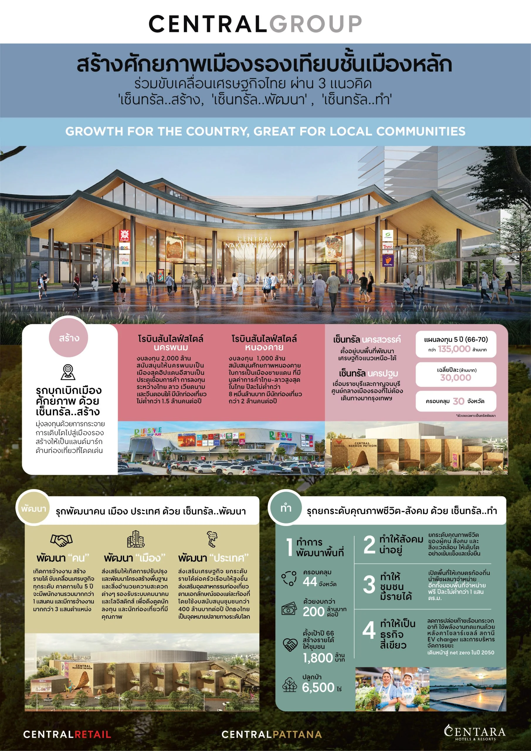 กลุ่มได้รุกบุกเบิกเมืองศักยภาพ ด้วย เซ็นทรัล..สร้าง สร้างเมืองให้เข้มแข็ง ด้วยการมุ่งมั่นเดินหน้าขยายโครงการต่างๆ ภายใต้การลงทุนที่มุ่งเน้นผลกระทบเชิงบวกต่อสังคมอย่างรอบด้าน (Impact Investment) โดยกระจายการเติบโตไปสู่พื้นที่ที่มีศักยภาพ หรือ “เมืองรอง” ด้วยการชูบทบาทการเป็น Central of Life ศูนย์กลางของชีวิต เร่งเครื่องสร้างและพัฒนาย่านที่มีคุณภาพสู่แลนด์มาร์กแห่งใหม่อันโดดเด่น เพื่อเป็นแม่เหล็กภาคท่องเที่ยวและบริการใหม่ ถือเป็นเครื่องยนต์เศรษฐกิจหลักของประเทศ โดยมีแผนการลงทุน 5 ปี (2566-2570) ของ บมจ. เซ็นทรัลพัฒนา (CPN) กว่า 135,000 ล้านบาท หรือเฉลี่ยปีละ 30,000 ล้านบาท ครอบคลุม 30 จังหวัด