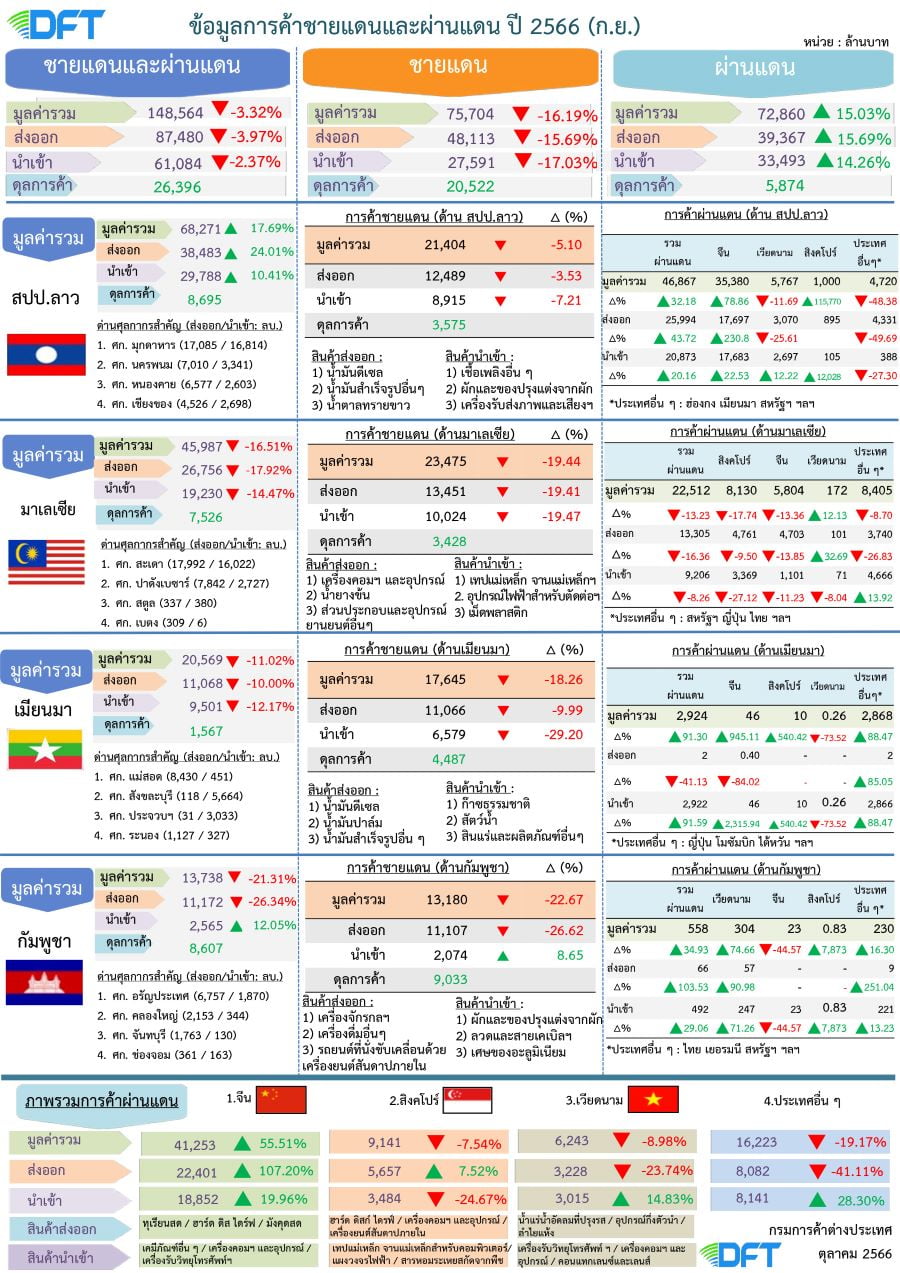 1. การค้าชายแดนกับ 4 ประเทศ (มาเลเซีย สปป.ลาว กัมพูชา และเมียนมา) มีมูลค่าการค้ารวม 75,704 ล้านบาท ลดลง 16.19% จากเดือน ก.ย.ปีก่อน แบ่งเป็น การส่งออกมูลค่า 48,113 ล้านบาท ลดลง 15.69% และการนำเข้ามูลค่า 27,591 ล้านบาท ลดลง 17.03% โดยไทยได้ดุลการค้ารวม 20,522 ล้านบาท