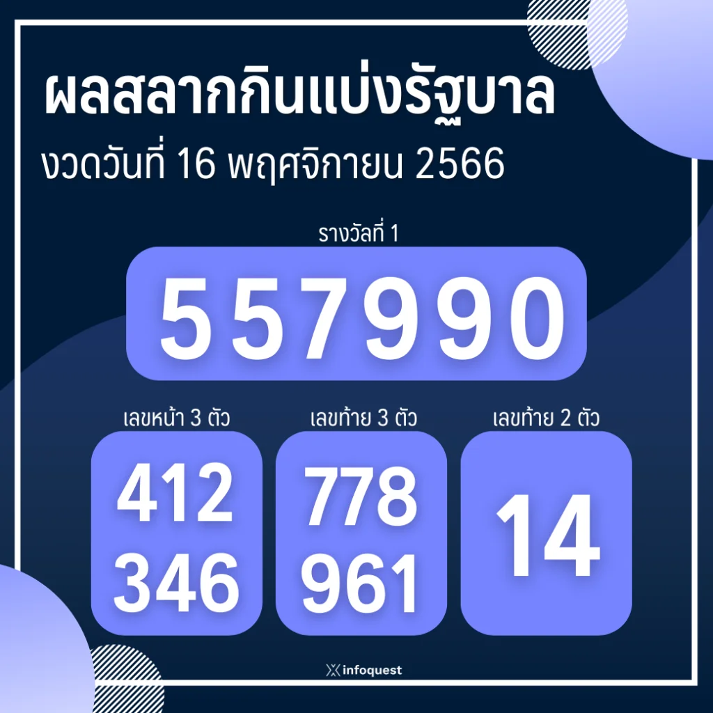 ผลการออกรางวัลสลากกินแบ่งรัฐบาล งวดประจำวันที่ 16 พฤศจิกายน 2566