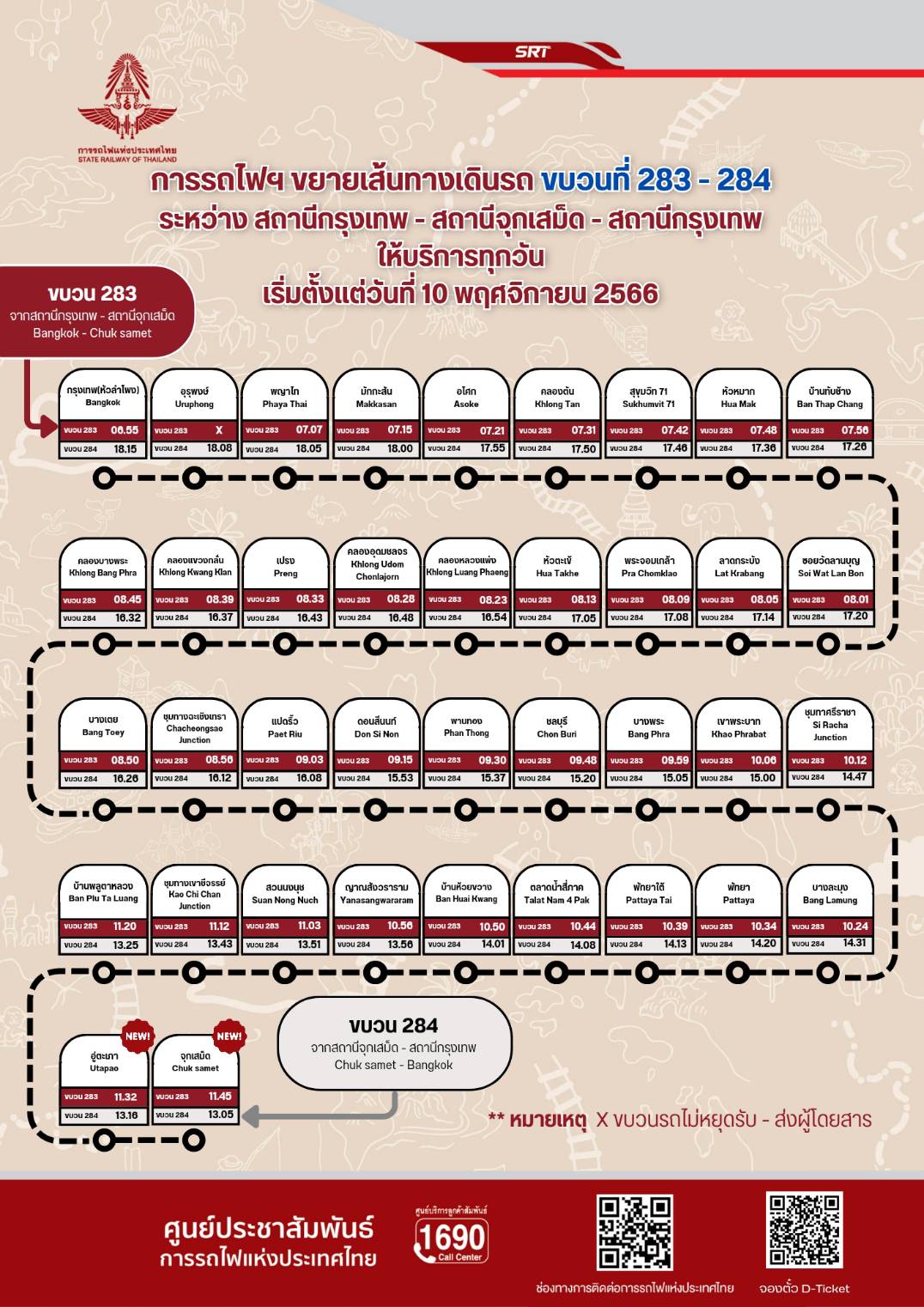 - เที่ยวกลับ ขบวนรถธรรมดาที่ 284 จุกเสม็ด – กรุงเทพ (หัวลำโพง) ออกจากสถานีจุกเสม็ด เวลา 13.05 น. ออกจากสถานีอู่ตะเภา 13.17 น. ถึงสถานีกรุงเทพ (หัวลำโพง) เวลา 18.15 น.