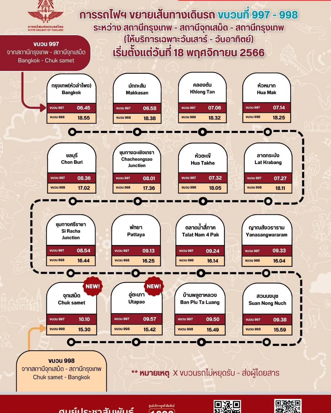 - เที่ยวไป ขบวนรถพิเศษโดยสารที่ 997 กรุงเทพ (หัวลำโพง) – จุกเสม็ด ออกจากสถานีกรุงเทพ (หัวลำโพง) เวลา 06.45 น. ถึงสถานีอู่ตะเภา 09.57 น. ถึงสถานีจุกเสม็ด เวลา 10.10 น.