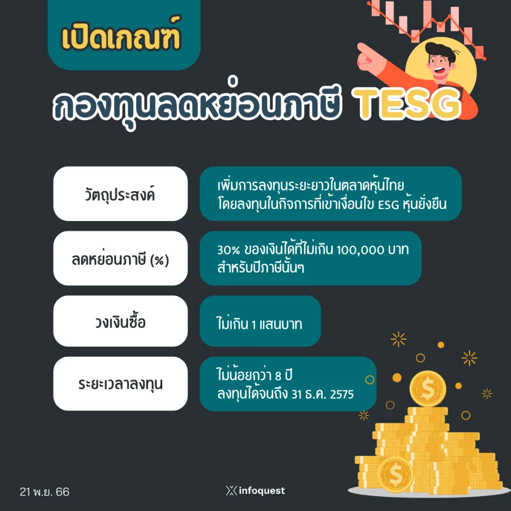 – การซื้อหน่วยลงทุน TESG ได้รับยกเว้นไม่ต้องนำเงินค่าซื้อหน่วยลงทุนมารวมคำนวณภาษีเงินได้บุคคลธรรมดา ในอัตราไม่เกิน 30% ของเงินได้เฉพาะส่วนที่ไม่เกิน 100,000 บาทสำหรับปีภาษีนั้นๆ
