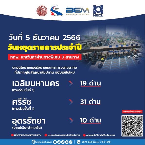 การทางพิเศษแห่งประเทศไทย (กทพ.) กระทรวงคมนาคม ยกเว้นค่าผ่านทางพิเศษของทางพิเศษ รวม 3 สายทาง ในวันอังคารที่ 5 ธันวาคม 2566 (วันคล้ายวันพระราชสมภพของพระบาทสมเด็จพระบรมชนกาธิเบศร มหาภูมิพลอดุลยเดชมหาราชบรมนาถบพิตร) ตั้งแต่เวลา 00.01 น. ถึง 24.00 น. ซึ่งเป็นวันหยุดราชการประจำปีตามประกาศสำนักนายกรัฐมนตรี ประกอบด้วย