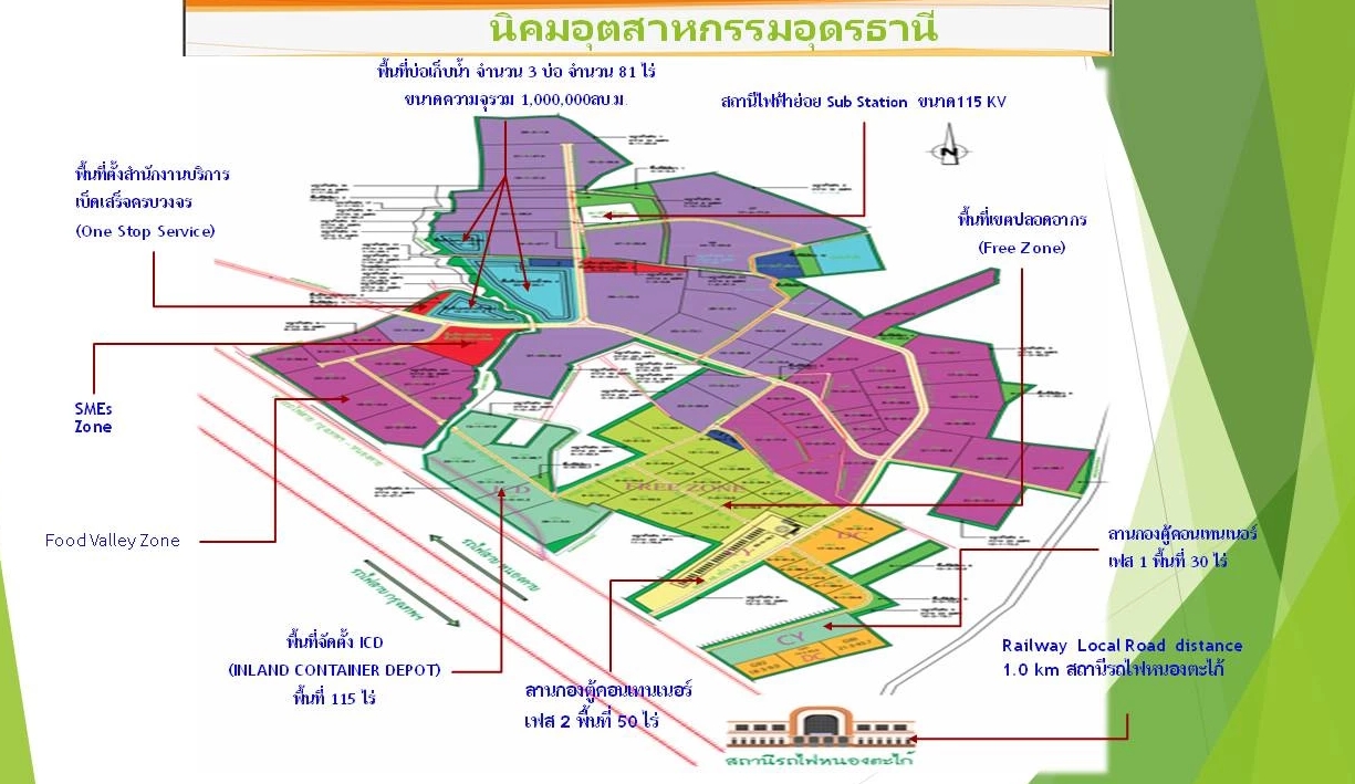 นอกจากนี้ บริษัท เมืองอุตสาหกรรมอุดรธานี จำกัด ยังมีแผนพัฒนาพื้นที่กว่า 400 ไร่ ที่อยู่ติดกับทางรถไฟสายกรุงเทพฯ-หนองคาย เพื่อพัฒนาเป็นศูนย์ logistic park ในระยะที่ 1 ก่อสร้างอาคารคลังสินค้าให้เช่า และขออนุญาตจัดตั้งโรงพักสินค้าพร้อมลานกองเก็บตู้คอนเทนเนอร์ (CY) เพื่อบรรจุและตรวจปล่อยสินค้าขาเข้าและขาออก ระยะที่ 2 ขออนุญาตจัดตั้งเขตศุลกากร พร้อมลานฝากตู้คอนเทนเนอร์ภายในประเทศ Inland Container Depot : ICD ที่สามารถเชื่อมระบบรางเข้ามาภายในพื้นที่เพื่อให้บริการขนส่งสินค้าทางรางเต็มรูปแบบ
