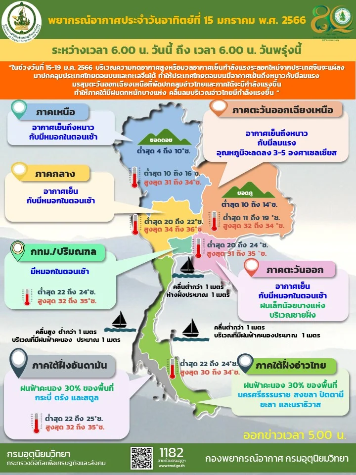 กรมอุตุนิยมวิทยา ออกประกาศเรื่อง อากาศหนาวเย็นบริเวณประเทศไทยตอนบนและคลื่นลมแรงบริเวณอ่าวไทย ฉบับที่ 4 ในช่วงวันที่ 15-19 ม.ค.66 บริเวณความกดอากาศสูงหรือมวลอากาศเย็นกำลังแรงระลอกใหม่จากประเทศจีนจะแผ่ล…
