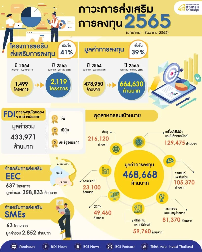 นายนฤตม์ เทอดสถีรศักดิ์ เลขาธิการคณะกรรมการส่งเสริมการลงทุน (บีโอไอ) เปิดเผยว่า ในปี 2565 มีโครงการขอรับการส่งเสริมการลงทุนรวมทั้งสิ้น 2,119 โครงการ เพิ่มขึ้นจากปีก่อน 41% โดยมีเงินลงทุน 664,630…