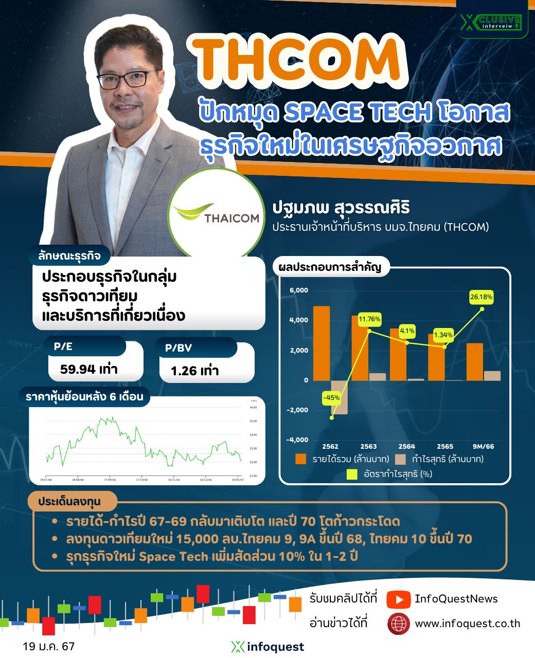หลังจากที่บมจ.ไทยคม (THCOM)ประมูลได้สิทธิวงโคจรตำแหน่ง 119.5 องศาตะวันออก และตำแหน่ง 78.5 องศาตะวันออกเมื่อต้นปี 66 หนุนให้ราคาหุ้น THCOM ดีดตัวขึ้นตอบรับอนาคตสดใส ผู้บริหาร THCOM ให้ความมั่นใจกับอนาคตใหม่ของบริษัทที่เห็นภาพสดใสตั้งแต่ปี 67 และมีธุรกิจ Space Tech ที่จะเป็น S-Curve ใหม่ที่มีโอกาสแทนที่ธุรกิจดาวเทียม