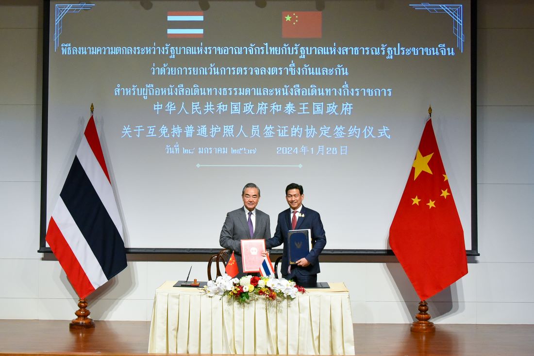 นายชัย วัชรงค์ โฆษกประจำสำนักนายกรัฐมนตรี เปิดเผยว่า วันนี้ รัฐบาลไทยโดยนายปานปรีย์ พหิทธานุกร รองนายกรัฐมนตรีและ รมว.ต่างประเทศ และนายหวัง อี้ ผู้อำนวยการสำนักงานคณะกรรมการกลางด้านกิจการต่างประเทศประจำพรรคคอมมิวนิสต์จีน และ รมว.ต่างประเทศสาธารณรัฐประชาชนจีน ได้ร่วมลงนามความตกลงระหว่างรัฐบาลแห่งราชอาณาจักรไทยกับรัฐบาลแห่งสาธารณรัฐประชาชนจีน ว่าด้วยการยกเว้นการตรวจลงตราซึ่งกันและกัน สำหรับผู้ถือหนังสือเดินทางธรรมดาและหนังสือเดินทางกึ่งราชการ โดยความตกลงฉบับนี้จะมีผลใช้บังคับตั้งแต่วันที่ 1 มี.ค.67