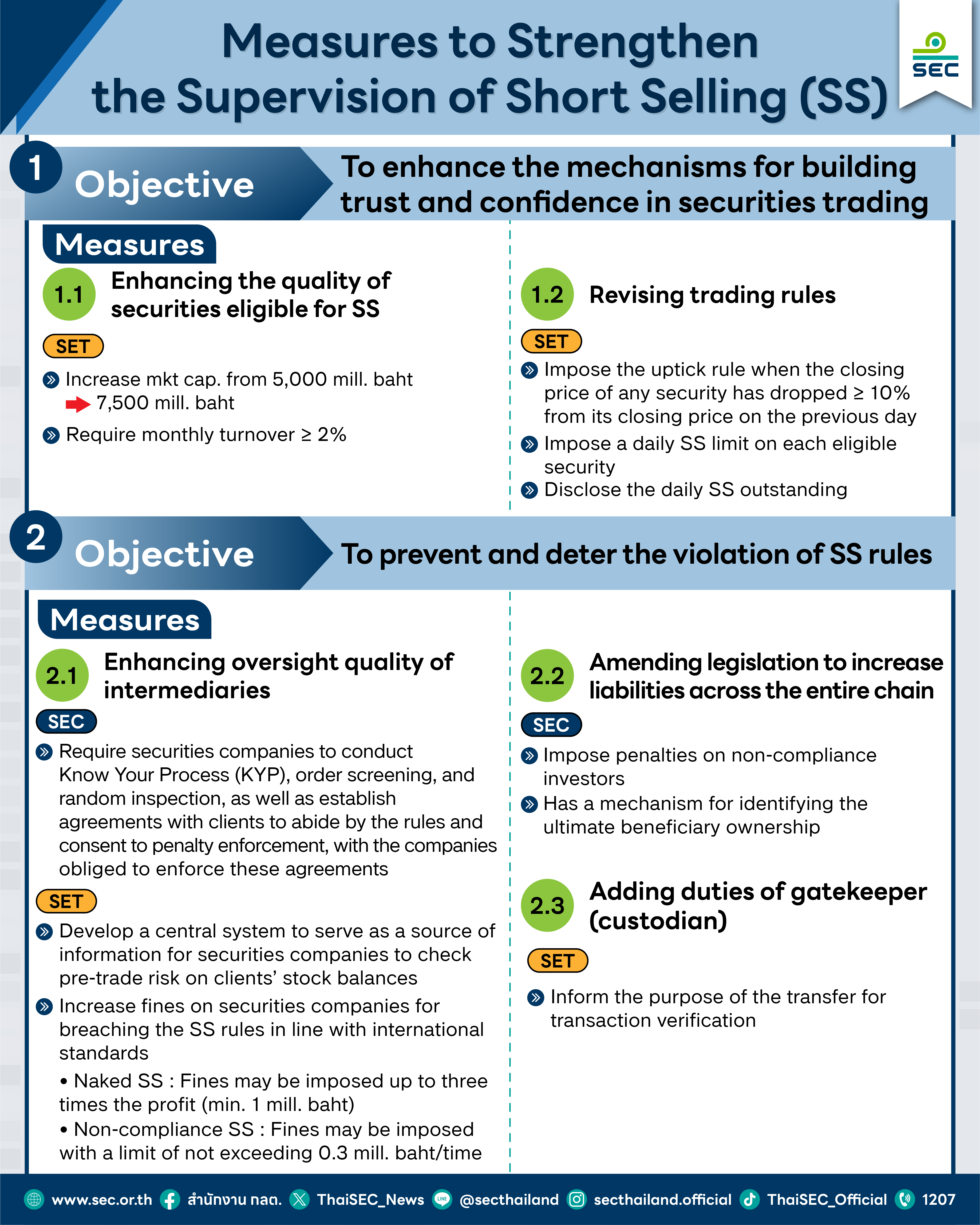 อย่างไรก็ตาม ที่ผ่านมา ตลท.มีมาตรการดูแลในเรื่อง Short Selling เช่น การกำกับปริมาณซื้อคืนไม่ให้เกิน 10% และกำหนดเกณฑ์หุ้น Short Selling เฉพาะหุ้นขนาดใหญ่ หรืออยู่ใน SET100 ที่เป็นหุ้นมาร์เก็ตแคปสูงตั้งแต่ 5,000 ล้านบาทขึ้นไป ซึ่งปัจจุบันมีอยู่ 292 หลักทรัพย์ที่สามารถทำได้ อีกทั้งการส่งคำสั่งซื้อขายก็มีกฎกติกาชัดเจน คือ ห้ามทำ Naked Short Selling หรือก่อนที่จะขายจะต้องมีหุ้นในพอร์ต หรือหากเป็น Short Selling ก็ต้องมีการยืมหุ้นมาก่อน ก่อนส่งคำสั่งขาย เป็นต้น