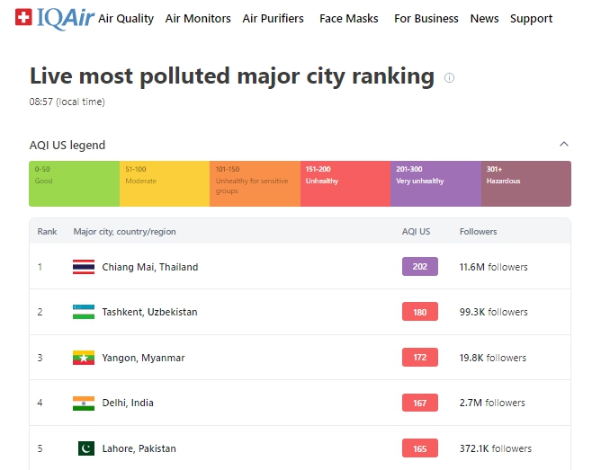 “เชียงใหม่” มลพิษพุ่งสูงต่อเนื่องมาหลายวัน เช้านี้ยังครองแชมป์อันดับ 1 เมืองใหญ่ที่มีมลพิษมากที่สุดของโลก โดยเช้านี้เวลา 08.57 น. เว็บไซต์ IQAir รายงานคุณภาพอากาศของทั่วโลก พบว่า เชียงใหม่ ประเทศไทย มีค่า AQI อยู่ที่ 202 อยู่ในระดับสีม่วง (AQI = 201-300) หรือมีผลกระทบต่อทุกคนอย่างรุนแรง