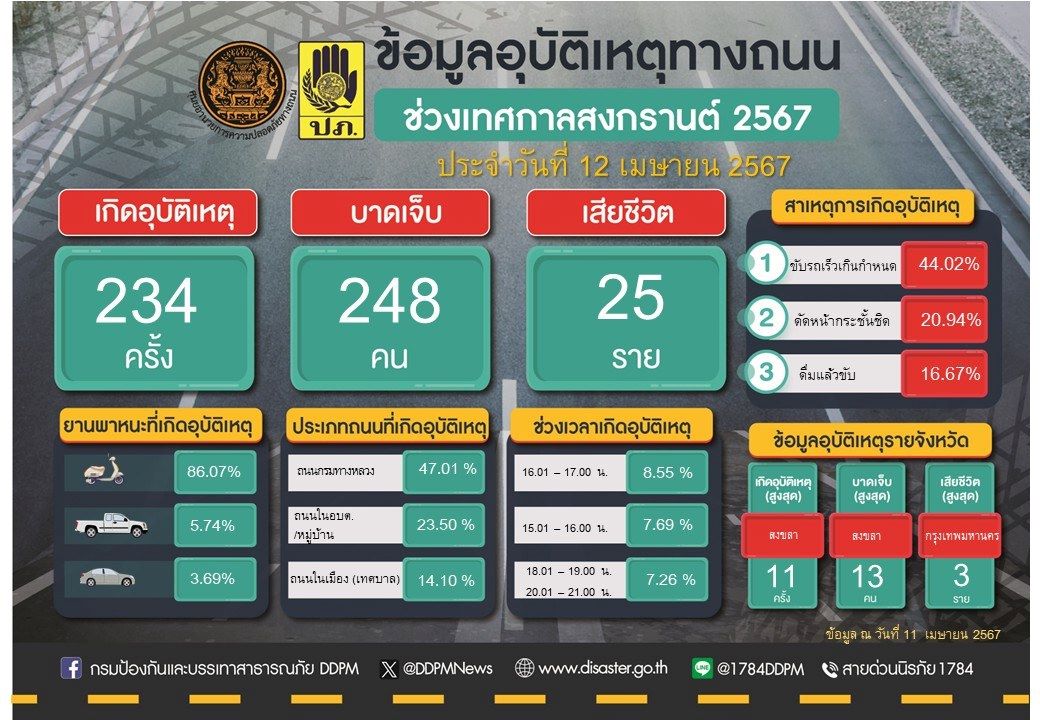 นายไชยวัฒน์ จุนถิระพงศ์ อธิบดีกรมป้องกันและบรรเทาสาธารณภัย (ปภ.) ในฐานะเลขานุการศูนย์อำนวยการความปลอดภัยทางถนน (ศปถ.) เปิดเผยว่า ศูนย์อำนวยการป้องกันและลดอุบัติเหตุทางถนนช่วงเทศกาลสงกรานต์ พ.ศ. 2567 เปิดเผยสถิติอุบัติเหตุทางถนนประจำวันที่ 11 เม.ย.67 ซึ่งเป็นวันแรกของการรณรงค์ “ขับขี่อย่างปลอดภัย เมืองไทยไร้อุบัติเหตุ” พบว่า มีการเกิดอุบัติเหตุ 234 ครั้ง ผู้บาดเจ็บ 248 คน ผู้เสียชีวิต 25 ราย