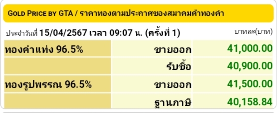 ราคาทอง (96.5%) ขายปลีกในประเทศเช้านี้กลับมาปรับตัวเพิ่มขึ้นจากครั้งก่อนบาททองคำละ 250 ตามสถานการณ์ราคาทองในตลาดโลกที่ปรับตัวเพิ่มขึ้น โดยสมาคมค้าทองคำแจ้งราคาเปิดตลาดครั้งแรกเมื่อเวลา 09.07 น. ทองแท่ง รับซื้อเข้าบาททองคำละ 40,900 ขายออกบาททองคำละ 14,100 ส่วนทองรูปพรรณ รับซื้อเข้าบาททองคำละ 40,158.84 ขายออกบาททองคำละ 41,500