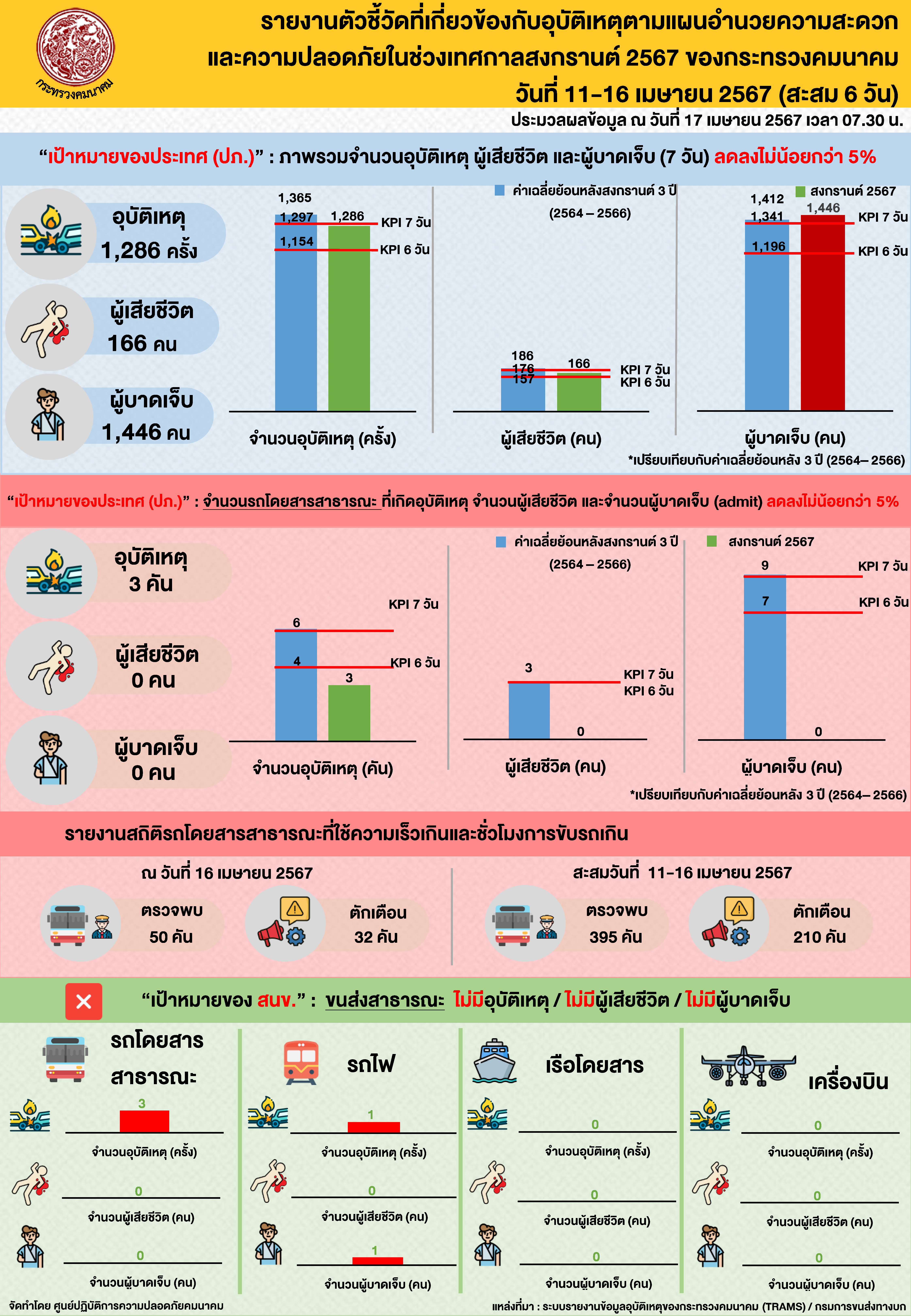 นายสุริยะ จึงรุ่งเรืองกิจ รมว.คมนาคม เปิดเผยถึงภาพรวมการเดินทางช่วงเทศกาลสงกรานต์ 2567 สะสม 6 วัน (11-16 เม.ย.) ว่า มีปริมาณการเดินทางด้วยระบบขนส่งสาธารณะภายในประเทศ และระหว่างประเทศ อยู่ที่ 15,035,465 คน-เที่ยว เพิ่มขึ้น 7.92% เมื่อเทียบกับช่วงเดียวกันของปีก่อน โดยจากการร่วมมือของทุกหน่วยงานจึงทำให้การบริหารจัดการการขนส่งสาธารณะ สามารถรองรับการเดินทางของประชาชนได้อย่างเพียงพอ ไม่มีผู้โดยสารตกค้าง โดยระบบรางมีการใช้บริการสูงสุด คิดเป็นสัดส่วน 43.41%