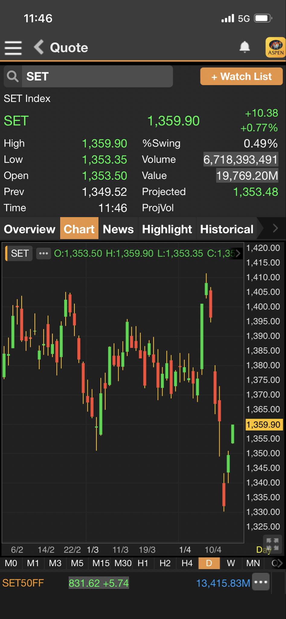 เมื่อเวลา 11.46 น.ดัชนี SET อยู่ที่ 1,359.90 จุด เพิ่มขึ้น 10.38 จุด (+0.77%)