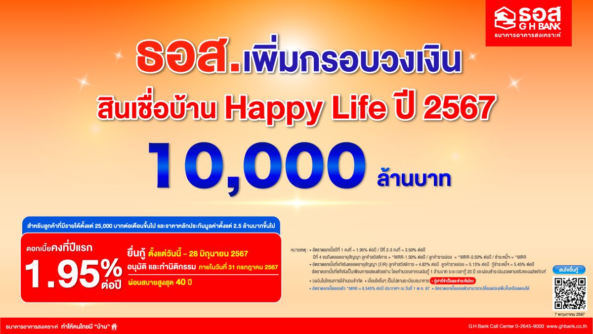 นายกมลภพ วีระพละ กรรมการผู้จัดการ ธนาคารอาคารสงเคราะห์ (ธอส.) เปิดเผยว่า หลังจากที่ ธอส. จัดทำสินเชื่อบ้าน Happy Life ปี 2567 กรอบวงเงิน 10,000 ล้านบาท สำหรับการซื้อที่อยู่อาศัยที่มีราคาตั้งแต่ 2.5 ล้านบาทขึ้นไป โดยจะได้รับอัตราดอกเบี้ยปีที่ 1 คงที่เท่ากับ 1.95% ต่อปี, ปีที่ 2-3 คงที่เท่ากับ 3.50% ต่อปี (อัตราดอกเบี้ยเฉลี่ย 3 ปีแรกเท่ากับ 2.98% เท่านั้น) และปีที่ 4 จนถึงตลอดอายุสัญญา กรณีลูกค้าสวัสดิการ เท่ากับ MRR-1.00% ต่อปี , ลูกค้ารายย่อย เท่ากับ MRR-0.50% ต่อปี และกรณีชำระหนี้ฯ เท่ากับ MRR ต่อปี (อัตราดอกเบี้ย MRR ธอส. ปัจจุบัน เท่ากับ 6.545% ต่อปี) ระยะเวลาการกู้นานสูงสุด 40 ปี เงินงวดปีแรกเพียงล้านละ 3,500 บาทต่อเดือน