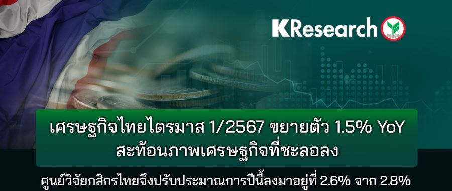 สำนักงานสภาพัฒนาการเศรษฐกิจและสังคมแห่งชาติ (สศช.) หรือสภาพัฒน์ ได้รายงานตัวเลขการเติบโตทางเศรษฐกิจในไตรมาสที่ 1/67 ขยายตัว 1.5%YoY เติบโตในอัตราที่ชะลอลงจากไตรมาสที่ 4/66 ที่ 1.7%YoY พร้อมปรับลดประมาณการเศรษฐกิจไทยปี 67 คาดว่าจะขยายตัวได้ในช่วง 2.0-3.0% มีค่ากลางที่ 2.5% ลดลงจากประมาณการเดิมที่ 2.2-3.2% มีค่ากลางที่ 2.7%
