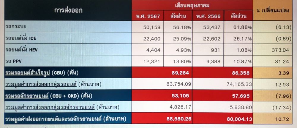 ขณะที่ยอดส่งออกในช่วง 5 เดือนแรกของปีนี้ (ม.ค.-พ.ค.67) อยู่ที่ 429,969 คัน ลดลง 2.28% โดยมีมูลค่าการส่งออกรถยนต์รวม 401,637.37 ล้านบาท เพิ่มขึ้น 9.23% จากช่วงเดียวกันของปีก่อน