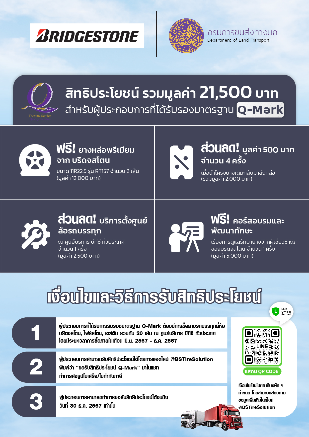 บริษัท บริดจสโตนเซลส์ (ประเทศไทย) จำกัด ร่วมกับกรมการขนส่งทางบกมอบสิทธิประโยชน์ด้านยางหล่อพรีเมียมจากบริดจสโตนสำหรับผู้ประกอบการทั่วประเทศที่สมัครรวมถึงผู้ที่ต่ออายุเพื่อขอรับรองมาตรฐานคุณภาพบริการการขนส่งสินค้าด้วยรถบรรทุก หรือ Q Mark ในปี 2567 เพื่อส่งเสริมและร่วมยกระดับคุณภาพมาตรฐานการขนส่งในไทย ตลอดจนสร้างความเชื่อมั่นและเพิ่มโอกาสให้ภาคธุรกิจและอุตสาหกรรมซึ่งนำไปสู่การเพิ่มขีดความสามารถทางการแข่งขันด้านโลจิสติกส์และซัพพลายเชน