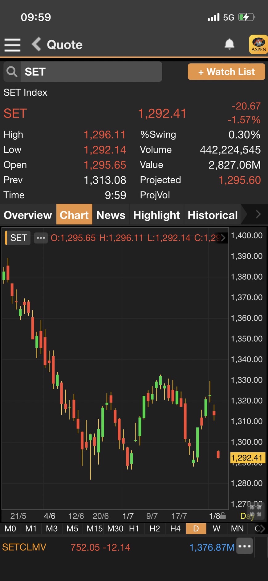 เมื่อเวลา 9.59 น. ดัชนี SET มาอยู่ที่ 1,292.41 จุด ลดลง 20.67 จุด (-1.57%)