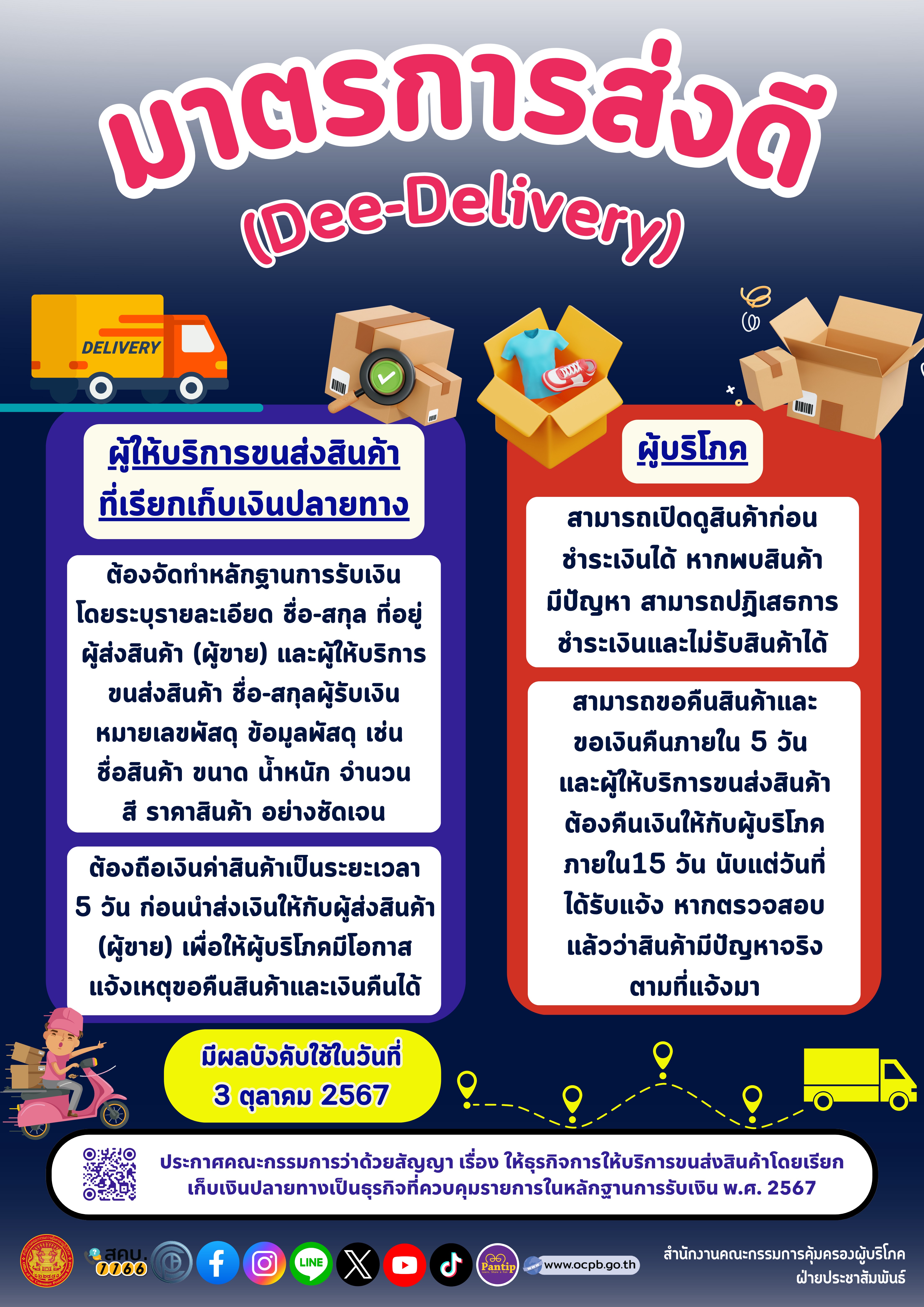“มาตรการส่งดี (Dee-Delivery)” มีวัตถุประสงค์เพื่อช่วยเหลือผู้บริโภคที่ซื้อสินค้าแบบเก็บเงินปลายทาง โดยผู้ให้บริการขนส่งสินค้าจะต้องจัดทำหลักฐานการรับเงินส่งมอบให้กับผู้บริโภคทันทีที่ได้รับชำระเงินจากผู้บริโภค และให้สิทธิผู้บริโภคสามารถเปิดดูสินค้าก่อนชำระเงินได้ หากพบว่าสินค้ามีปัญหา เช่น สั่งซื้อสินค้าแล้วได้รับสินค้าไม่ตรงกับที่สั่งซื้อ ไม่ได้สั่งซื้อสินค้าแต่มีสินค้าไปส่งแล้วเรียกเก็บเงินปลายทาง และสินค้าที่ได้รับมีความชำรุดบกพร่อง สามารถปฏิเสธการชำระเงินและไม่รับสินค้าได้ หรือหากไม่อยู่ในวิสัยที่จะเปิดดูสินค้า โดยรับสินค้าไว้และชำระเงินแล้ว มาตรวจสอบภายหลังพบว่ามีปัญหาดังกล่าวสามารถขอคืนสินค้าและขอเงินคืนได้ภายใน 5 วัน และผู้ให้บริการขนส่งสินค้าต้องคืนเงินให้กับผู้บริโภคภายใน 15 วัน นับแต่วันที่ได้รับแจ้ง