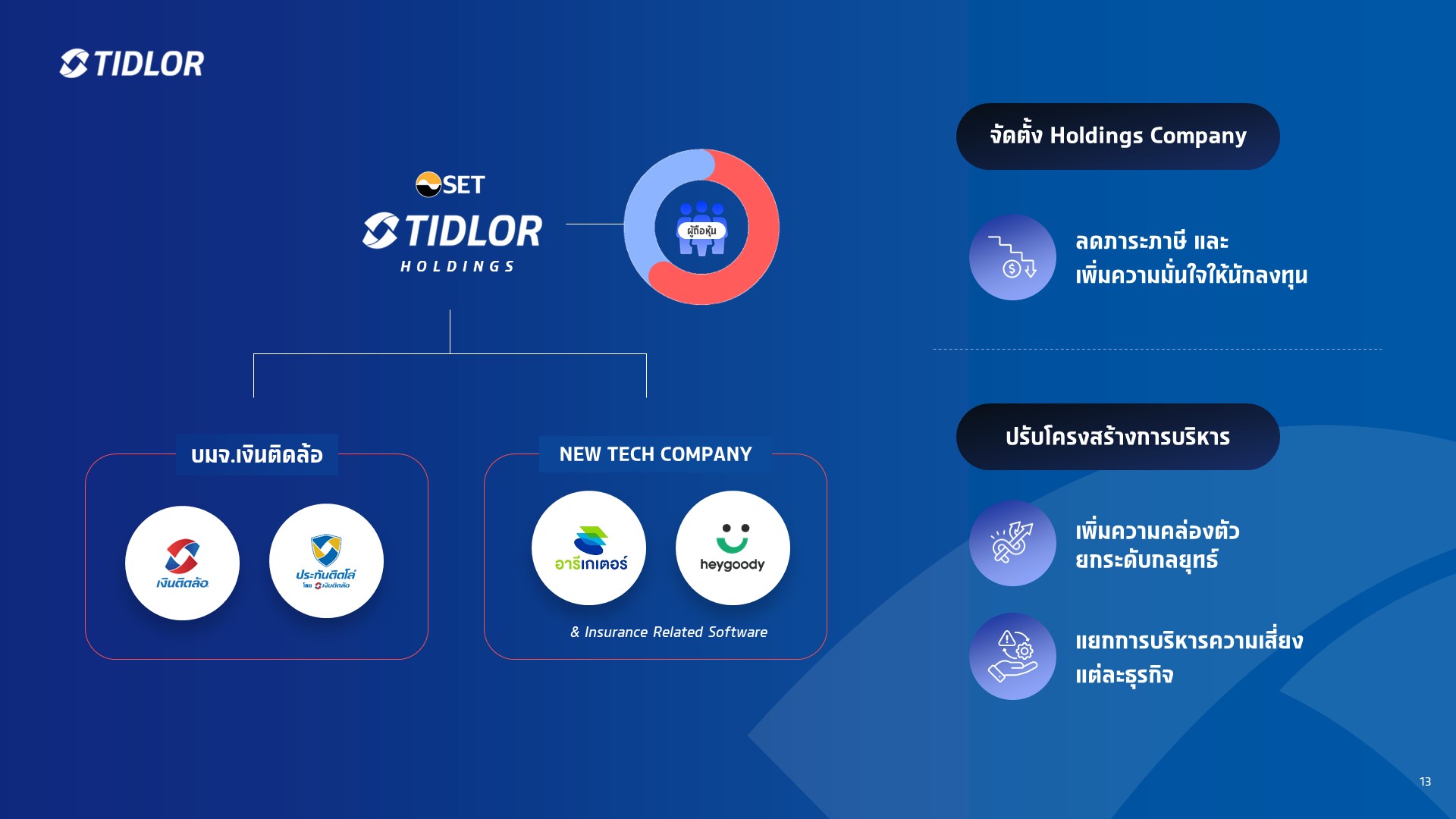 นายปิยะศักดิ์ อุกฤษฎ์นุกูลกรรมการผู้จัดการ บมจ.เงินติดล้อ (TIDLOR) กล่าวว่า บริษัทได้เดินหน้าในการปรับโครงสร้างธุรกิจเป็น Holding Company ซึ่งอยู่ระหว่างการยื่นขออนุญาตจากหน่วยงานที่เกี่ยวข้อง โดยคาดว่า “ติดล้อ โฮลดิ้งส์” จะตั้งโต๊ะทำคำเสนอซื้อหุ้นทั้งหมด (Tender Offer) จากผู้ถือหุ้นเดิม โดยวิธีการแลกหุ้นที่อัตรา 1:1 และคาดว่าจะกระบวนการทั้งหมดจะแล้วเสร็จในไตรมาส 4/67