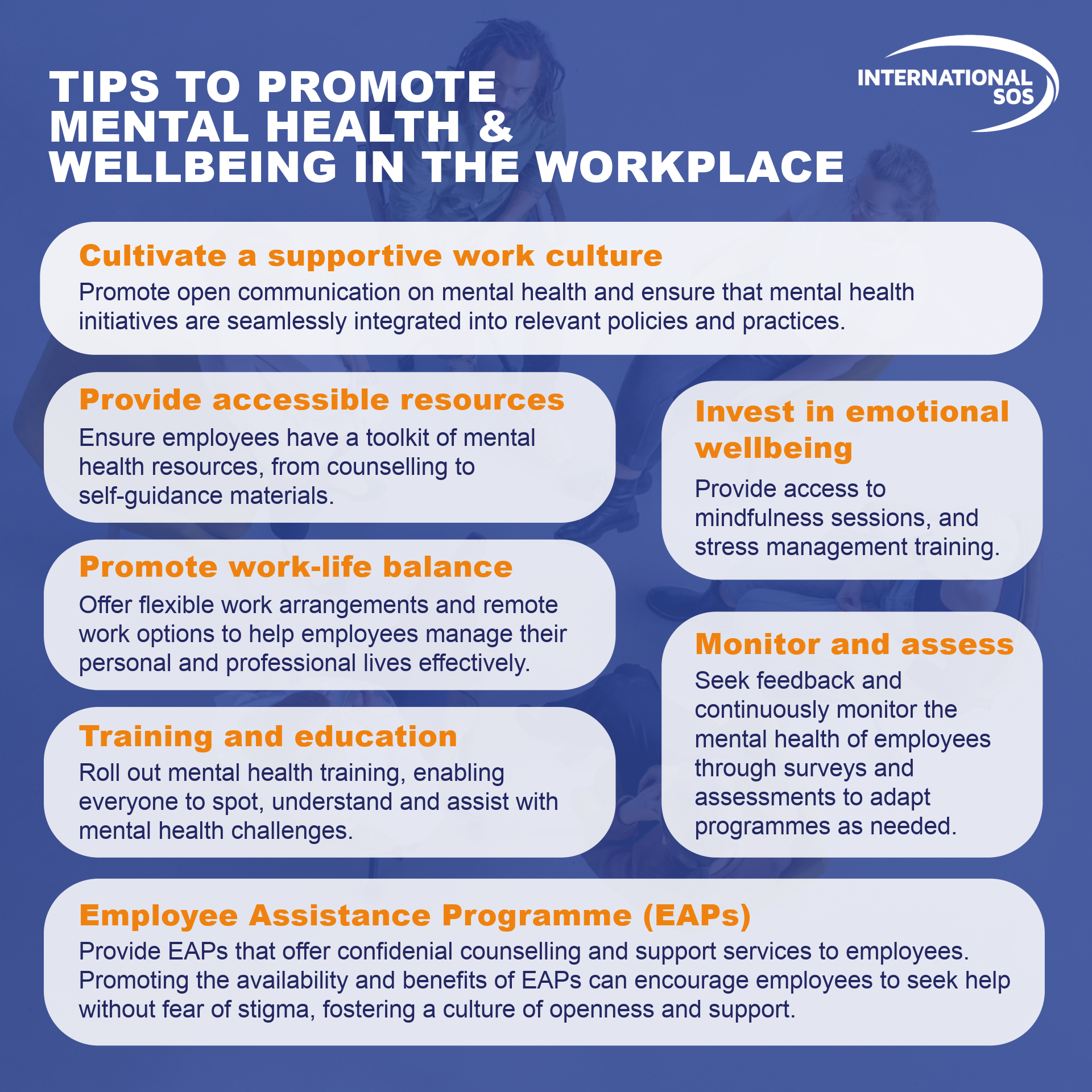 อินเตอร์เนชั่นแนล เอสโอเอส ขอแนะนำองค์กรต่าง ๆ เพื่อสนับสนุนสุขภาพจิตและสุขภาวะของพนักงาน ดังนี้